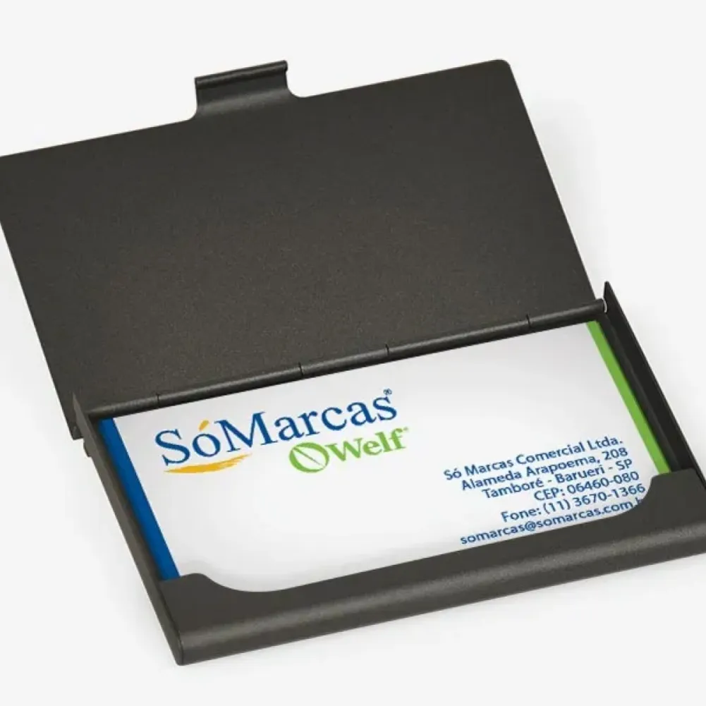 Confeccionado em alumínio cromado fosco ônix com detalhe brilhante na tampa. Possui tampa com fecho prático e design para bolso. Capacidade para, aproximadamente, 10 cartões. Tipo de gravação: Uma gravação a Laser. Dimensões do produto: 9,3x6x0,7cm Dimensões da embalagem: 115x73x20 mm (AxLxP) Peso da embalagem: 55 g Embalagem do produto: Caixa Kraft
