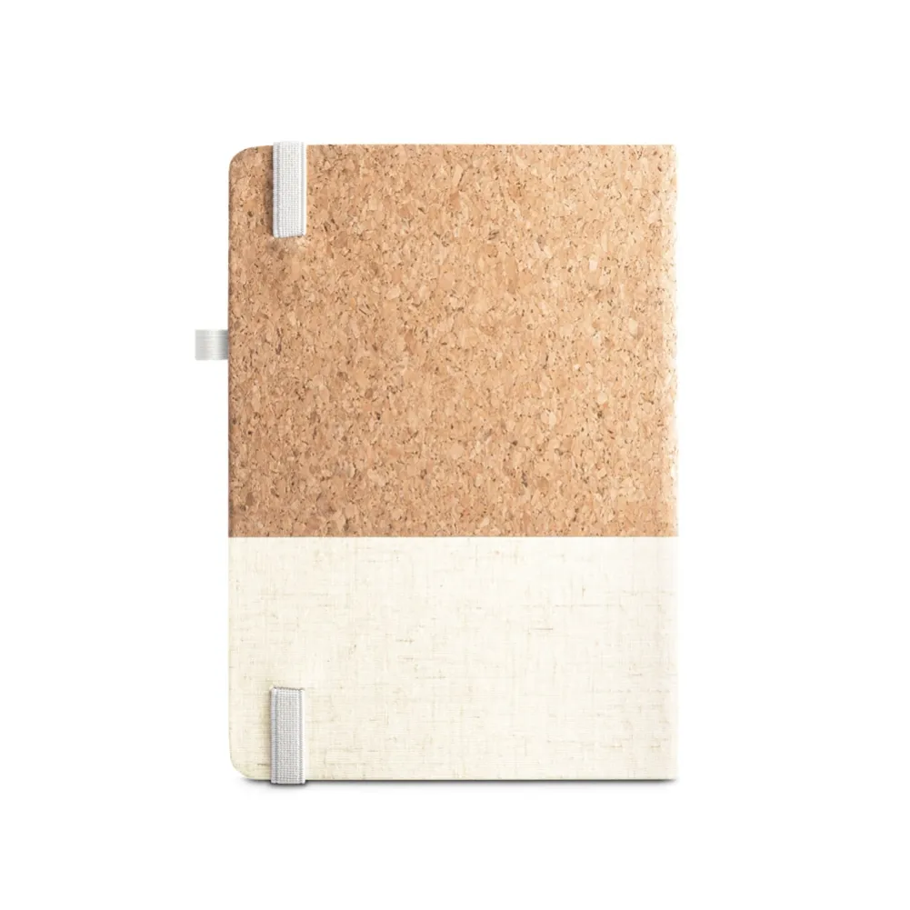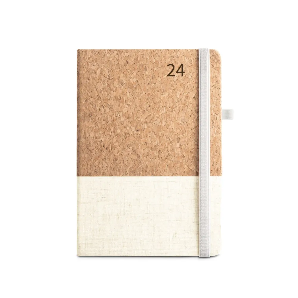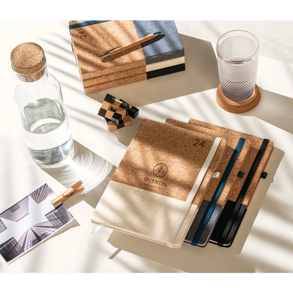 Agenda A5 em cortiça e linho com suporte para esferográfica (não incluída), marcador em fita e elástico para fecho na mesma cor. Está organizada num plano diário. Fornecida com bolsa de non-woven. 148 x 210 mm | Bolsa: 205 x 250 mm
