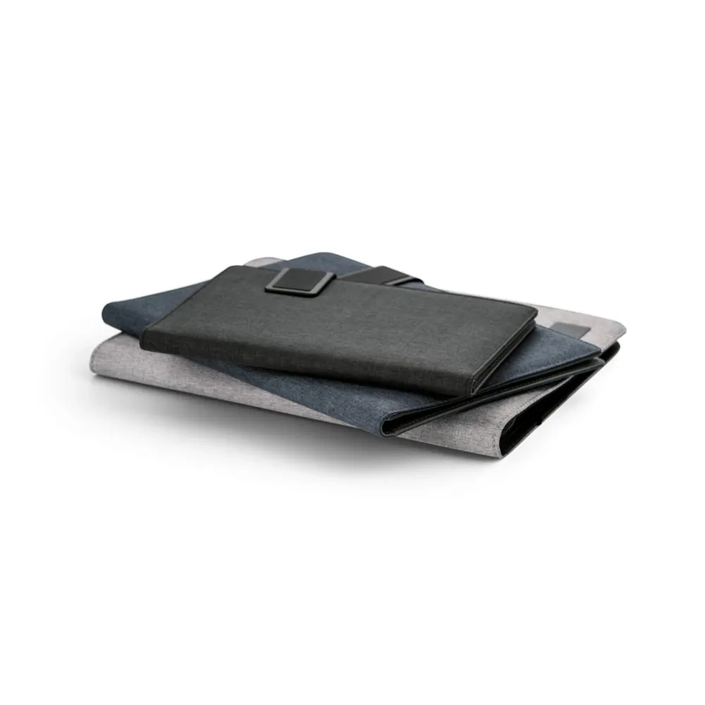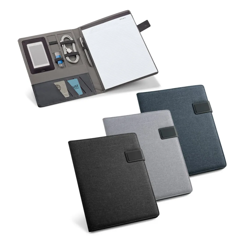 Pasta A4 em linho sintético e c. sintético com fecho magnético. O interior contém um caderno de 20 folhas pautadas, suporte para esferográfica (não inclusa), bolso para smartphone e suportes para cabos ou outros acessórios (não inclusos). Placa metálica com acabamento emborrachado. 233 x 310 x 18 mm | Placa: 50 x 30 mm