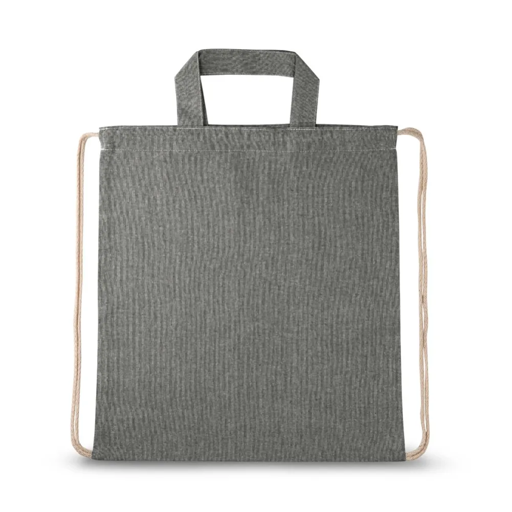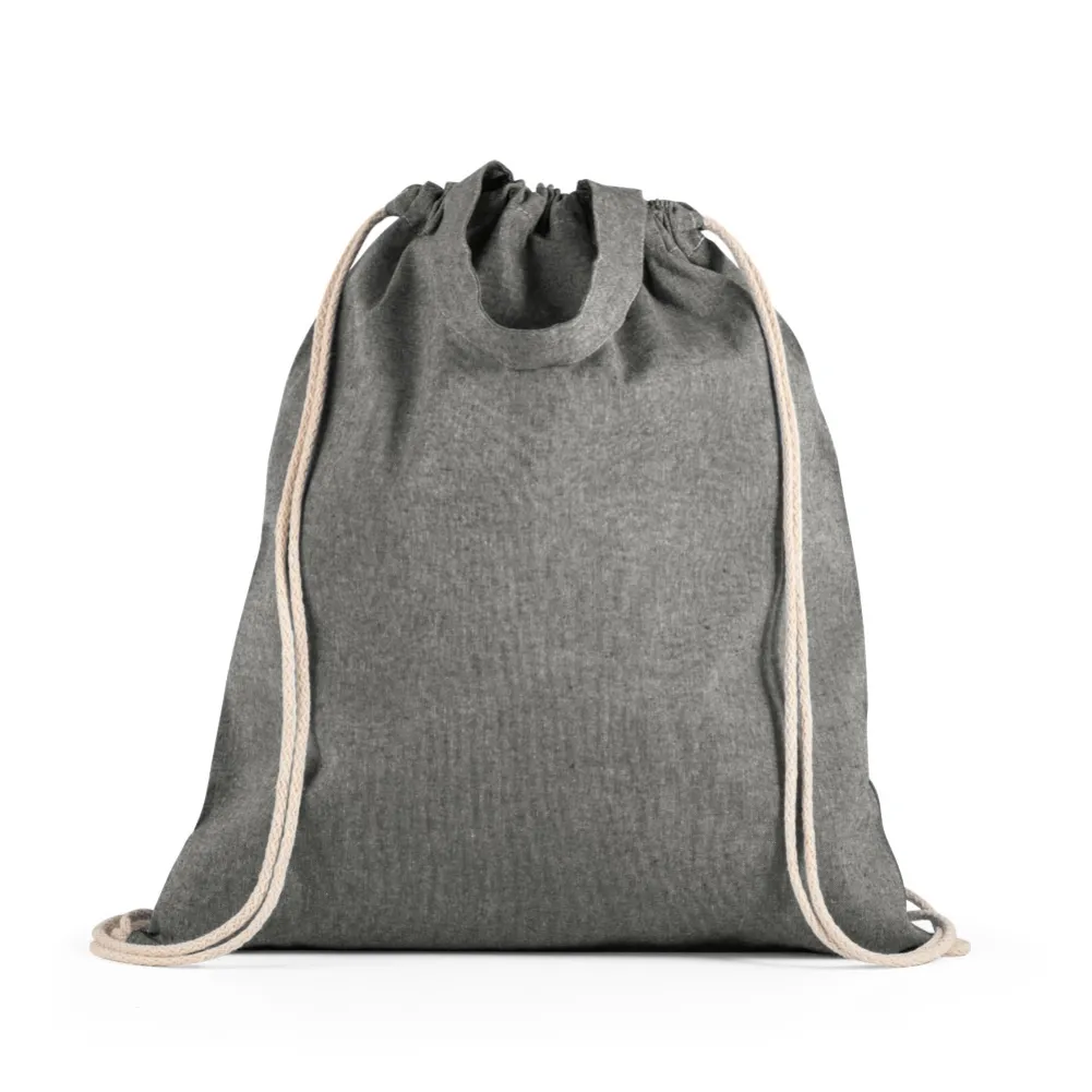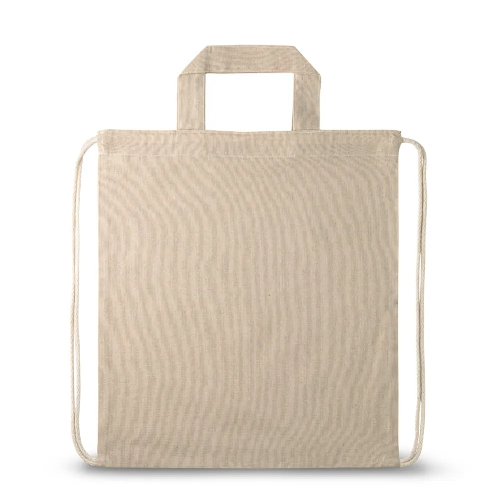 Sacola tipo mochila com algodão reciclado (140 g/m²), alças de 30 cm e cordões em algodão para fechar. 370 x 410 mm