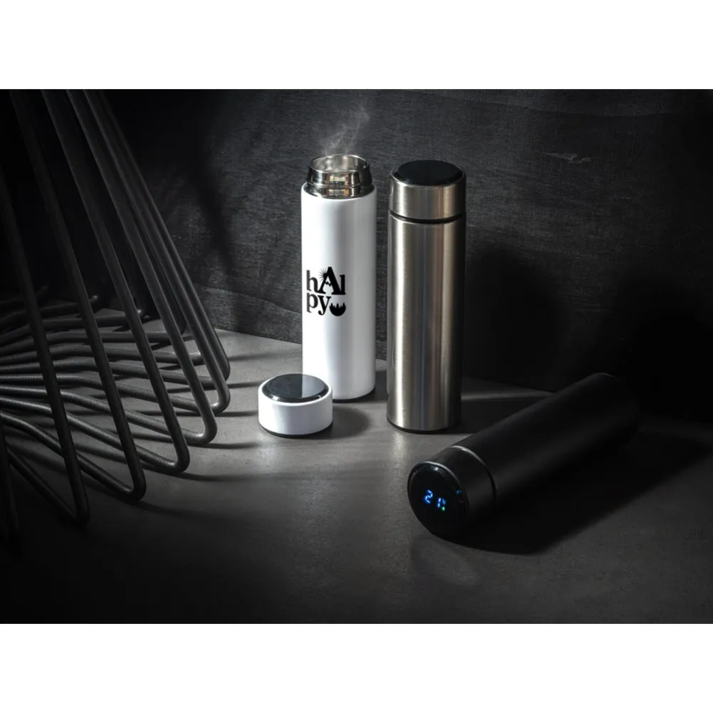 Squeeze em aço inox com parede dupla isolada a vácuo e tampa com termómetro digital (térmico). Inclui infusor para chá. Mantém as bebidas quentes por 8 h e frias por 24 h e tem capacidade até 470 mL. Certificação EU Food Grade. Fornecido em caixa. ø65 x 229 mm