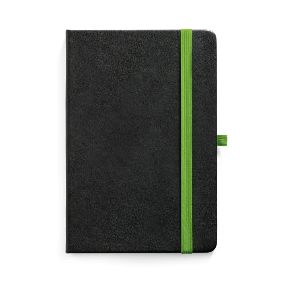 Bloco de notas A5 com capa rígida em PU, com 160 páginas pautadas. Bloco com substrato colorido permitindo a gravação a laser da cor do elástico. Contém fita separadora, bolso em papel na parte traseira da capa e suporte para esferográfica (não incluída). 140 x 210 mm