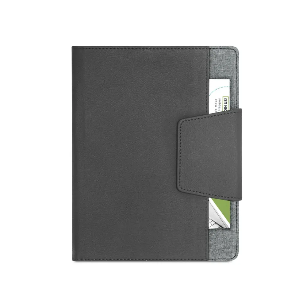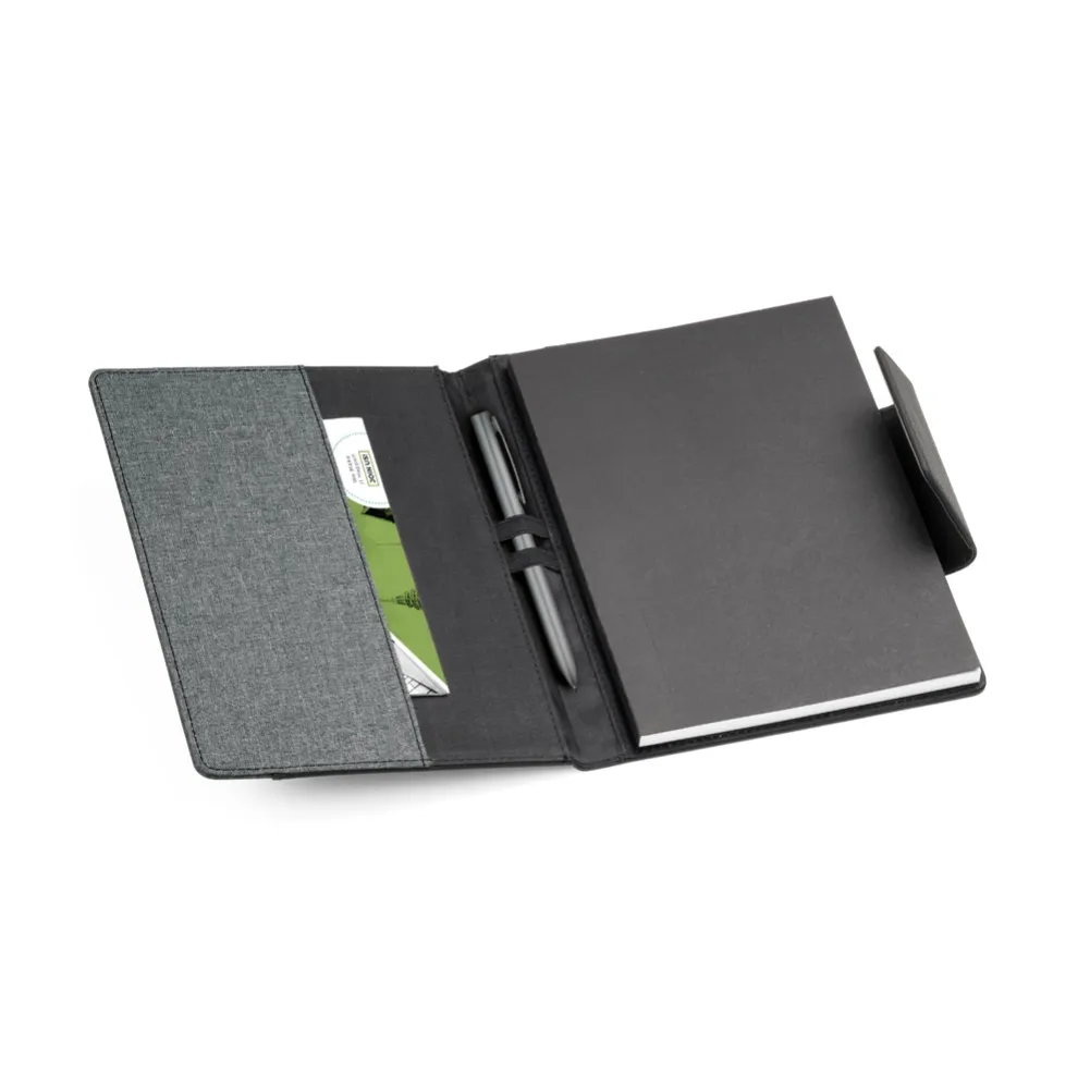 Capa em c. sintético e tecido em poliéster com caderno A5 removível com 80 folhas lisas. Contém fecho magnético, bolso exterior, bolso interior e suporte para esferográfica (não inclusa). Fornecida em embalagem de non-woven. 155 x 215 mm | Bolsa: 205 x 250 mm