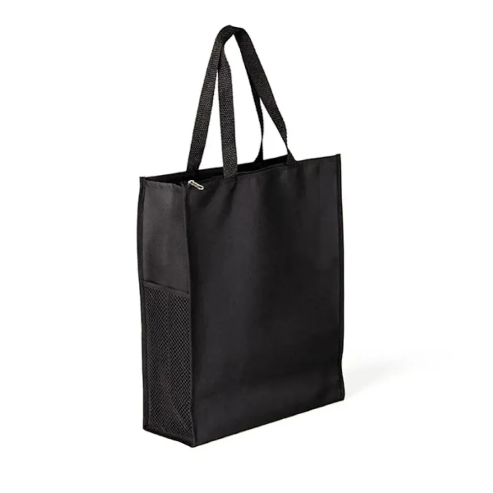 Sacola de mão em Nylon 600 preta. Conta alça; com tela lateral; compartimento duplo, um com fechamento em zíper. Tipo de gravação: Uma gravação em Silkscreen. Dimensões do produto: 30x37cm (com alça e aberto 30x56x11,5cm) Dimensões da embalagem: 300x370x0 mm (AxLxP) Peso da embalagem: 144 g Embalagem do produto: Plástica embalada de 10 em 10