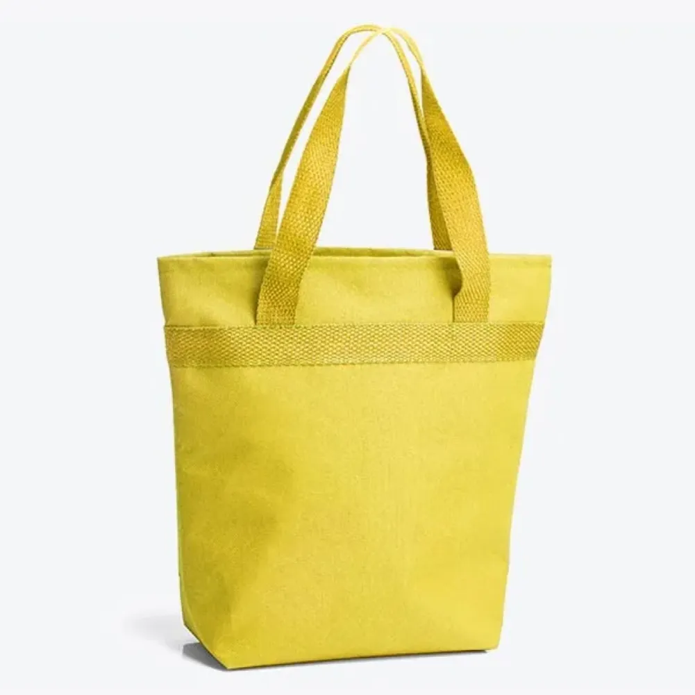 Sacola térmica em Nylon 600 amarela com alças. Capacidade: 5L (aprox.) Tipo de gravação: Uma gravação em Silkscreen. Dimensões do produto: 20,5x8x27cm Dimensões da embalagem: 290x260x0 mm (AxLxP) Peso da embalagem: 108 g Embalagem do produto: Plástica
