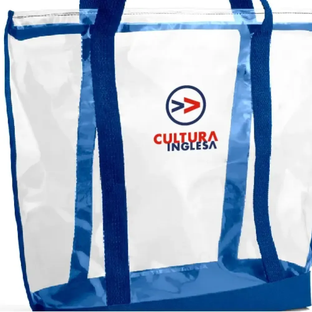 Sacola transparente confeccionada em PVC / Nylon 600 com detalhes em azul, possui acabamento reforçado em costura lateral. Conta com estrutura dobrável e duas alças de mão com detalhe que se estende até a base do produto. Tipo de gravação: Uma gravação em Silkscreen. Dimensões do produto: 40x30cm Dimensões da embalagem: 400x300x0 mm (AxLxP) Peso da embalagem: 88 g Embalagem do produto: Plástica