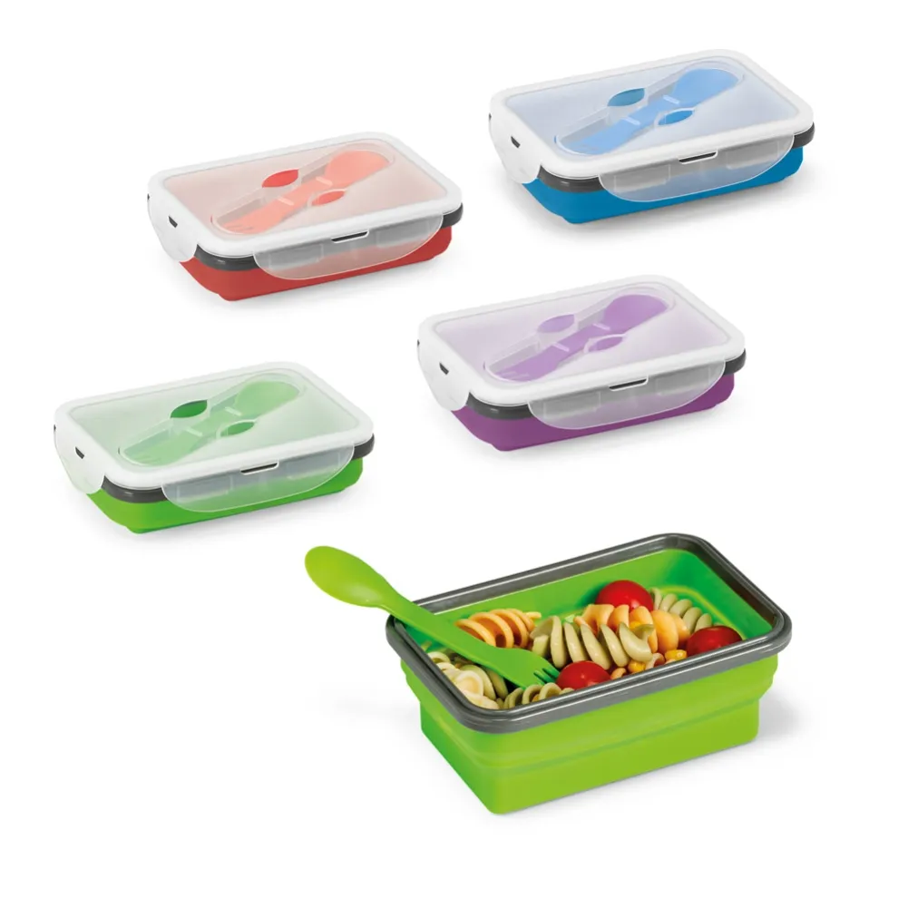 Marmita hermética retrátil em silicone e PP com um compartimento com capacidade até 640 mL. No topo da tampa tem um encaixe com um talher (incluso) com função 2 em 1, garfo e colher. Apta para microondas (retirar a tampa). Certificação EU Food Grade. 160 x 110 x 66 mm | Dobrada: 160 x 110 x 40 mm