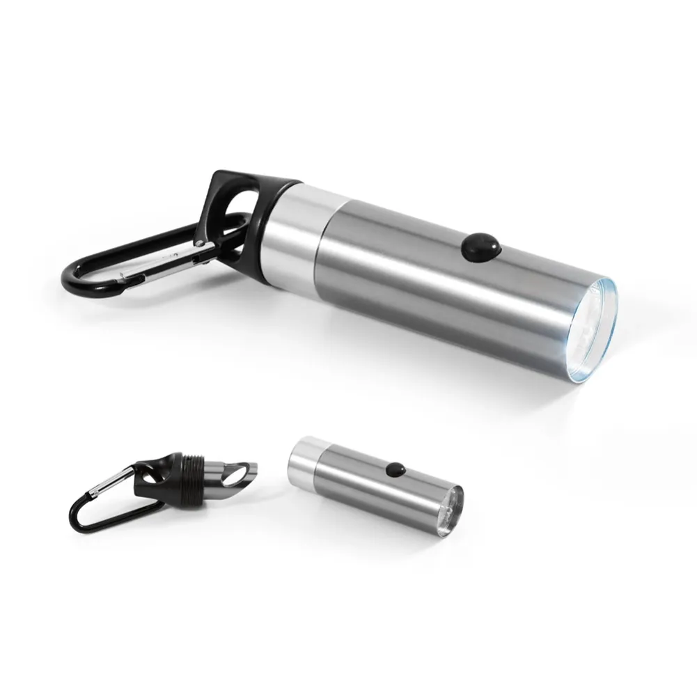 Lanterna em alumínio com 6 LEDs, abridor de garrafas e mosquetão. Incluso 2 pilhas CR2032. ø25 x 102 mm