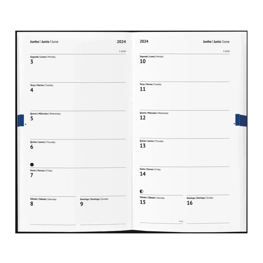 Agenda de bolso em tecido poliéster. Está organizada num plano bissemanal. Possui suporte para esferográfica (não incluída) e marcador em fita. 85 x 145 mm