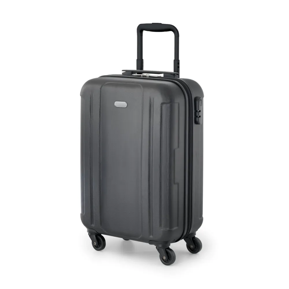 Mala de viagem executivo em ABS com interior forrado, com divisória. Fecho de segurança com senha na lateral, 4 rodas giratórias, pega extensível em alumínio, com mola (altura da pega estendida até 500 mm), e placa metálica removível com imã, para fácil gravação. Mala com capacidade até 31 L e peso de 2.25 kg. 355 x 550 x 200 mm | Placa: 50 x 20 mm