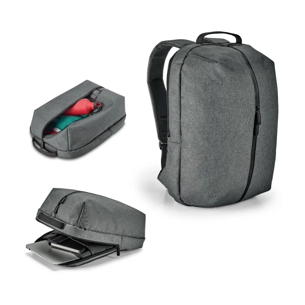 Mochila para notebook em 600D de alta densidade com 2 compartimentos forrados. Compartimento posterior com diversos bolsos interiores e 2 divisórias almofadadas para notebook até 156 e tablet 105. Compartimento frontal ideal para transporte de roupa (ou para lazer). Parte posterior e alças almofadadas. Alça para transporte em trolley. 300 x 450 x 160 mm