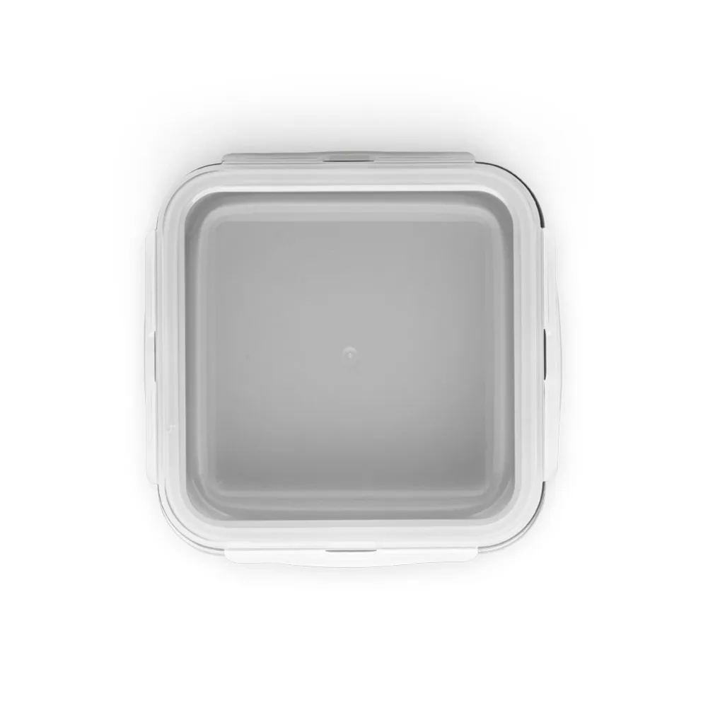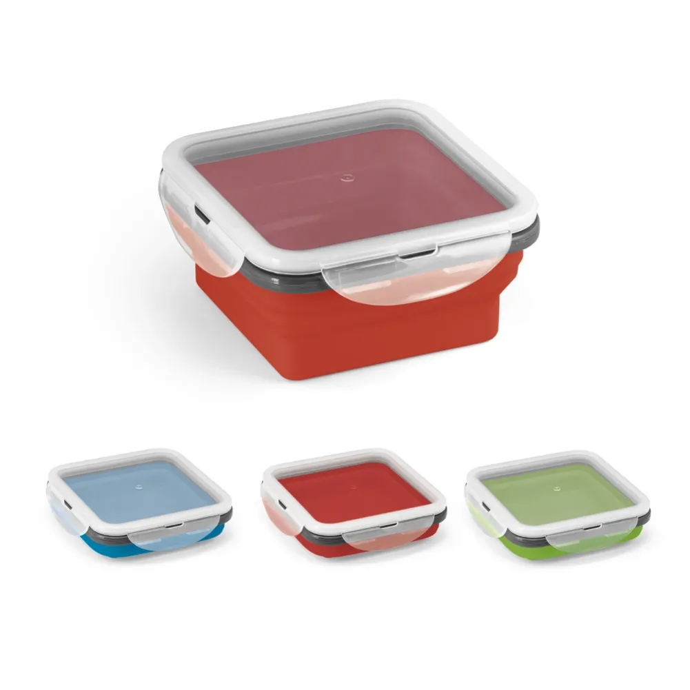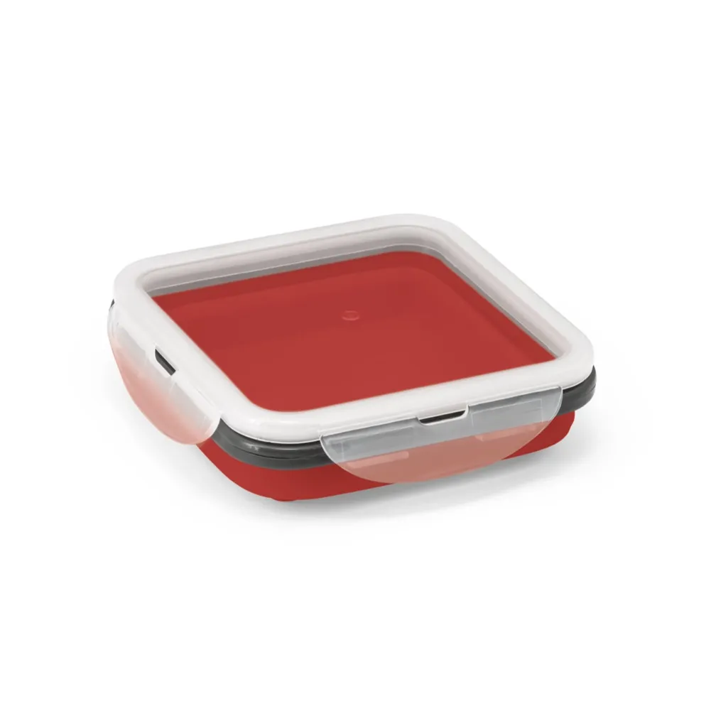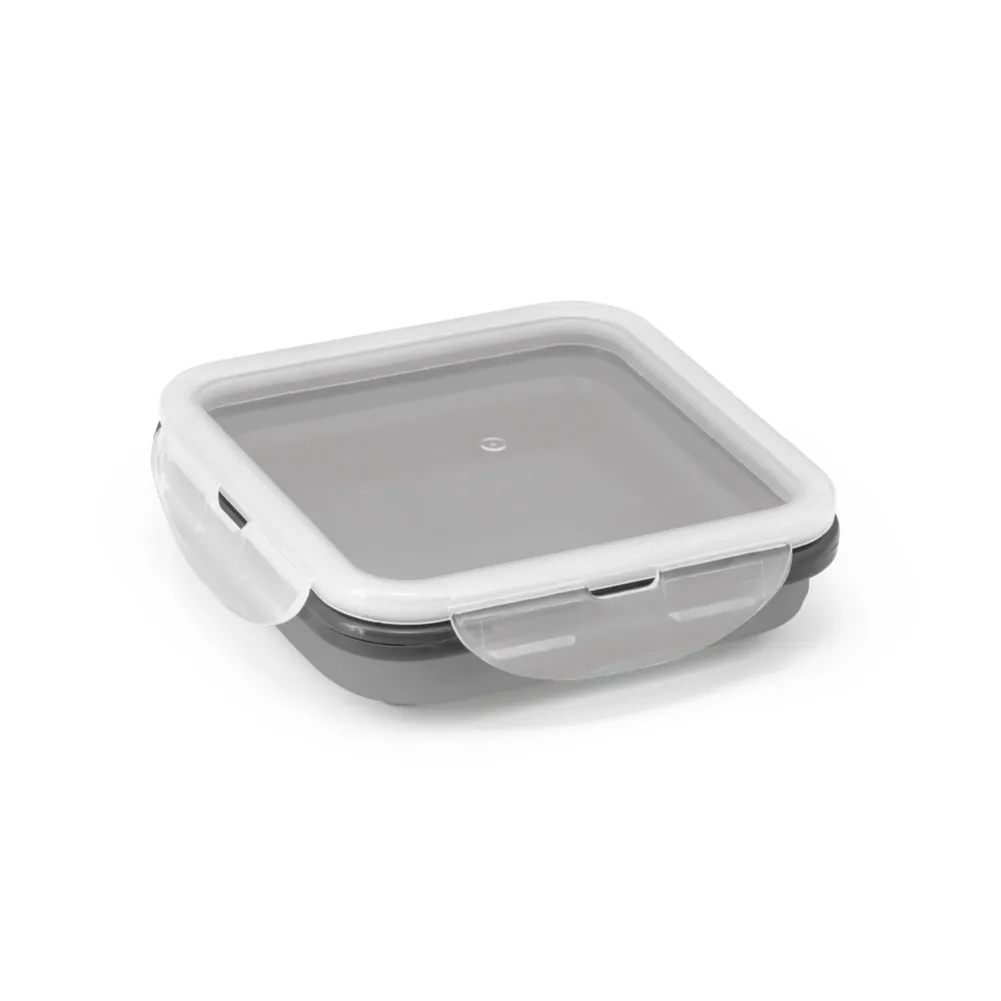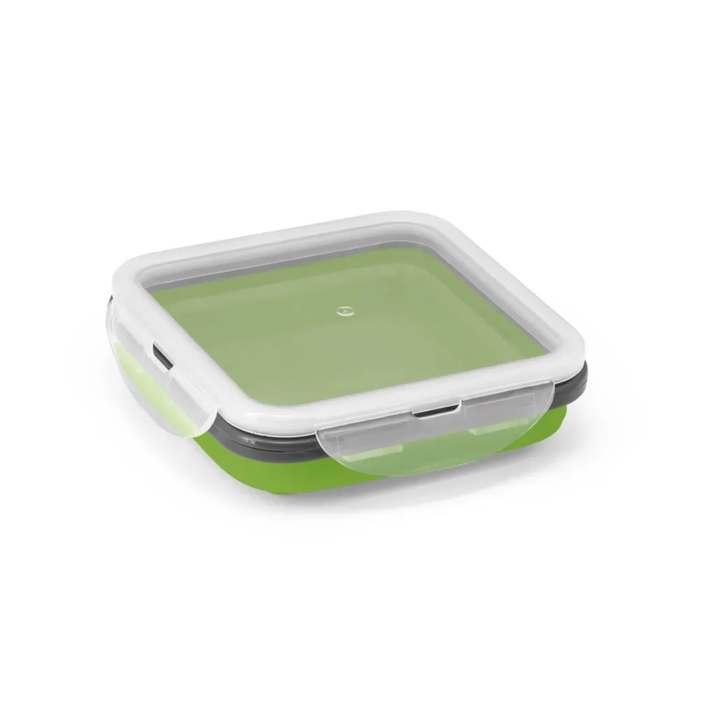 Marmita retrátil em silicone e PP com 1 compartimento e capacidade até 580 mL. Apta para microondas (retirar a tampa). Certificação EU Food Grade. 138 x 138 x 64 mm | Dobrada: 138 x 138 x 34 mm