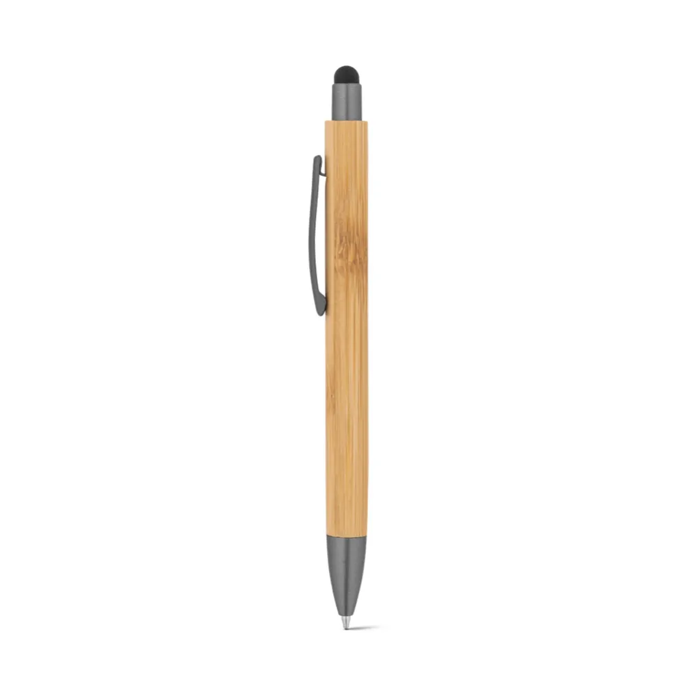 Esferográfica em bambu com clipe em metal e acabamento mate. Possui ponteira touch em cinza metálico para contato apropriado com ecrãs táteis. Escrita a preto. Ø11 x 141 mm