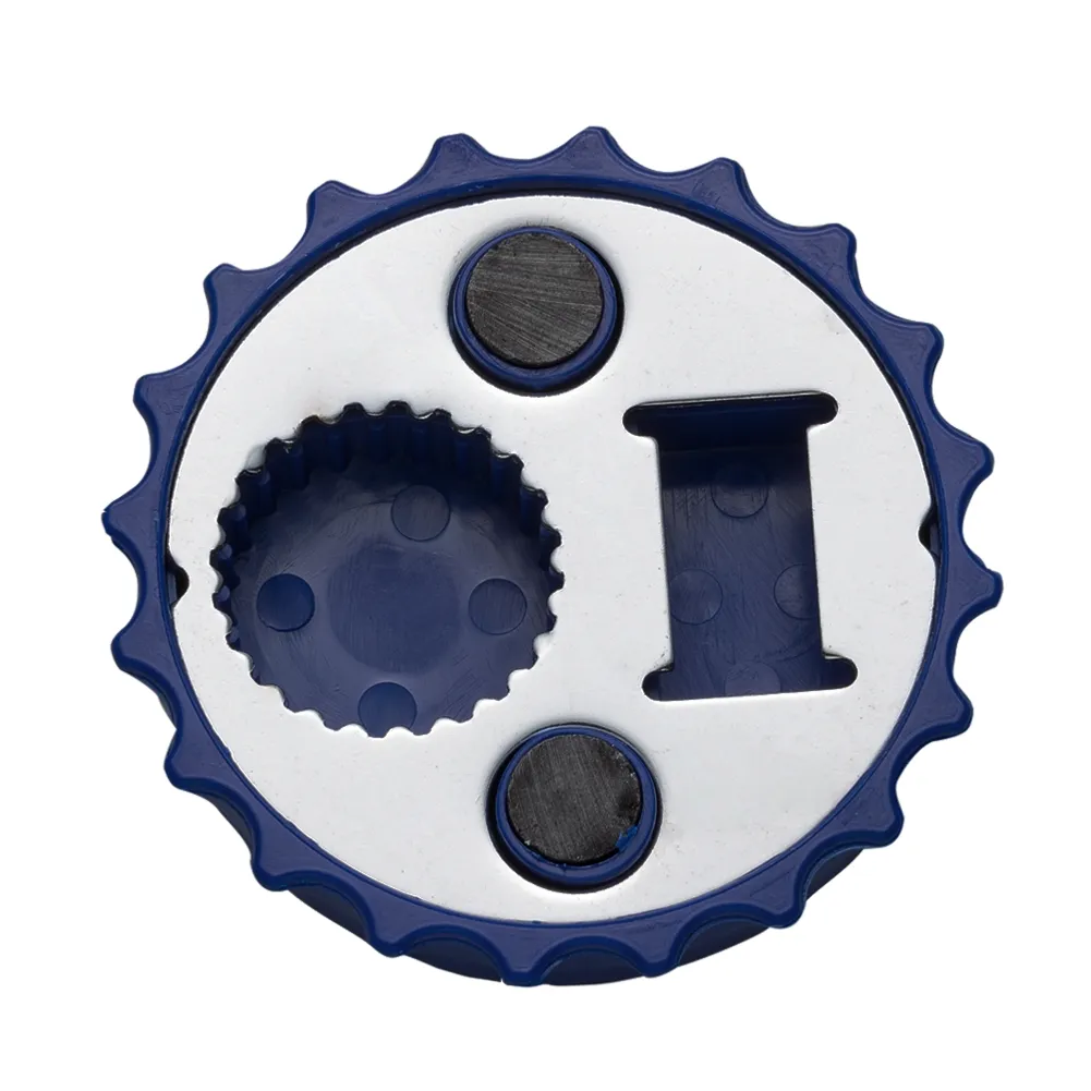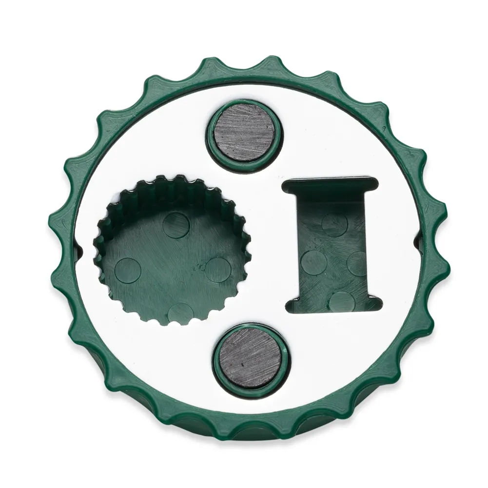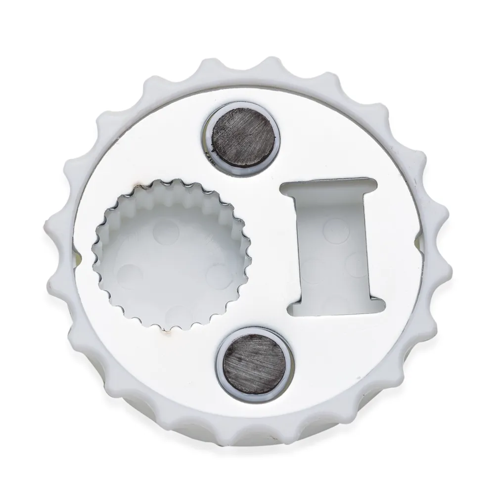Abridor formato tampa de garrafa com imã para geladeira, contém dois tipos de abridores de garrafa.