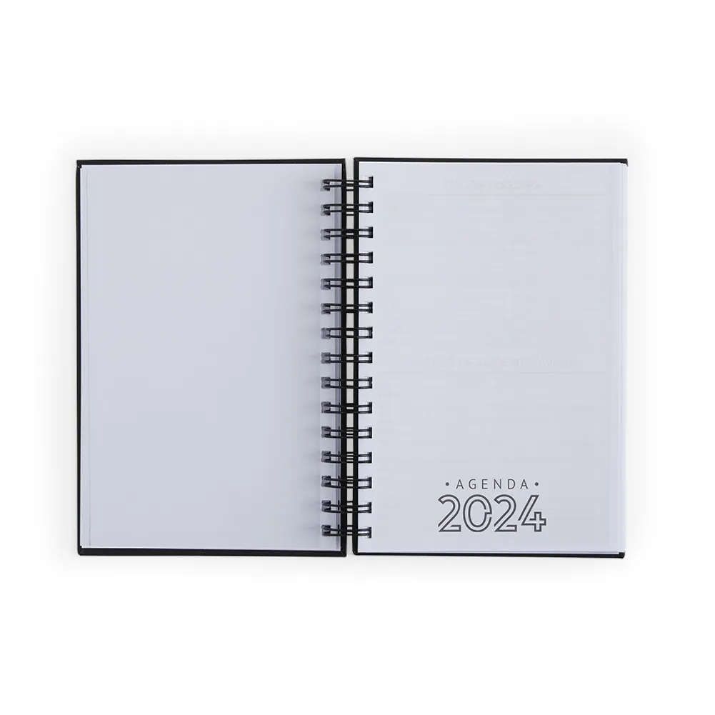 Agenda 2024 com capa em cromato e wire-o metálico. Contém páginas para dados pessoais, calendários de 2023 à 2025, orçamentos, anotações, planejamentos, endereços de contatos e mapas.
