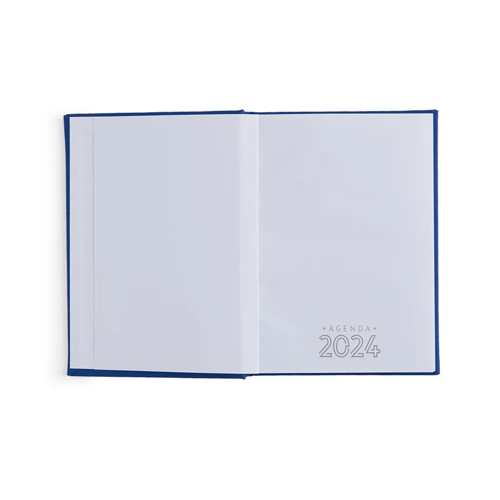 Agenda 2024 com capa emborrachada, contém páginas para dados pessoais, calendários de 2023 à 2025, planejamento e anotações.