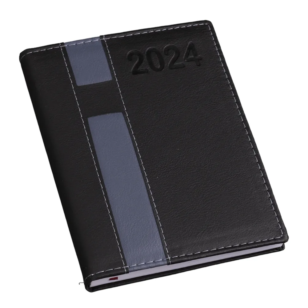 Agenda diária 2024 de couro sintético com suporte para caneta. Contém fita de cetim marca página, dados pessoais, calendário de 2023 à 2025, mapa do Brasil, mapa-múndi, índice telefônico e planejamento. Não acompanha caneta. OBS.: PEDIDOS APENAS MÚLTIPLOS DE 10 PEÇAS!