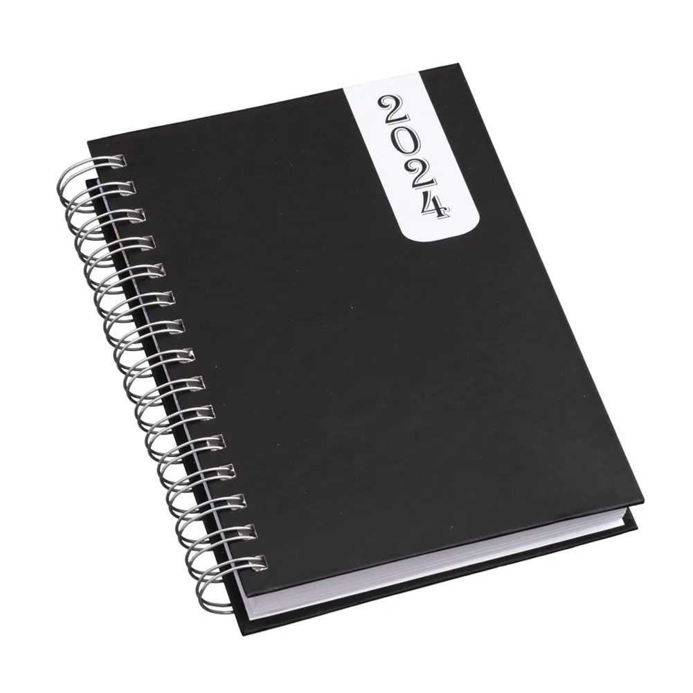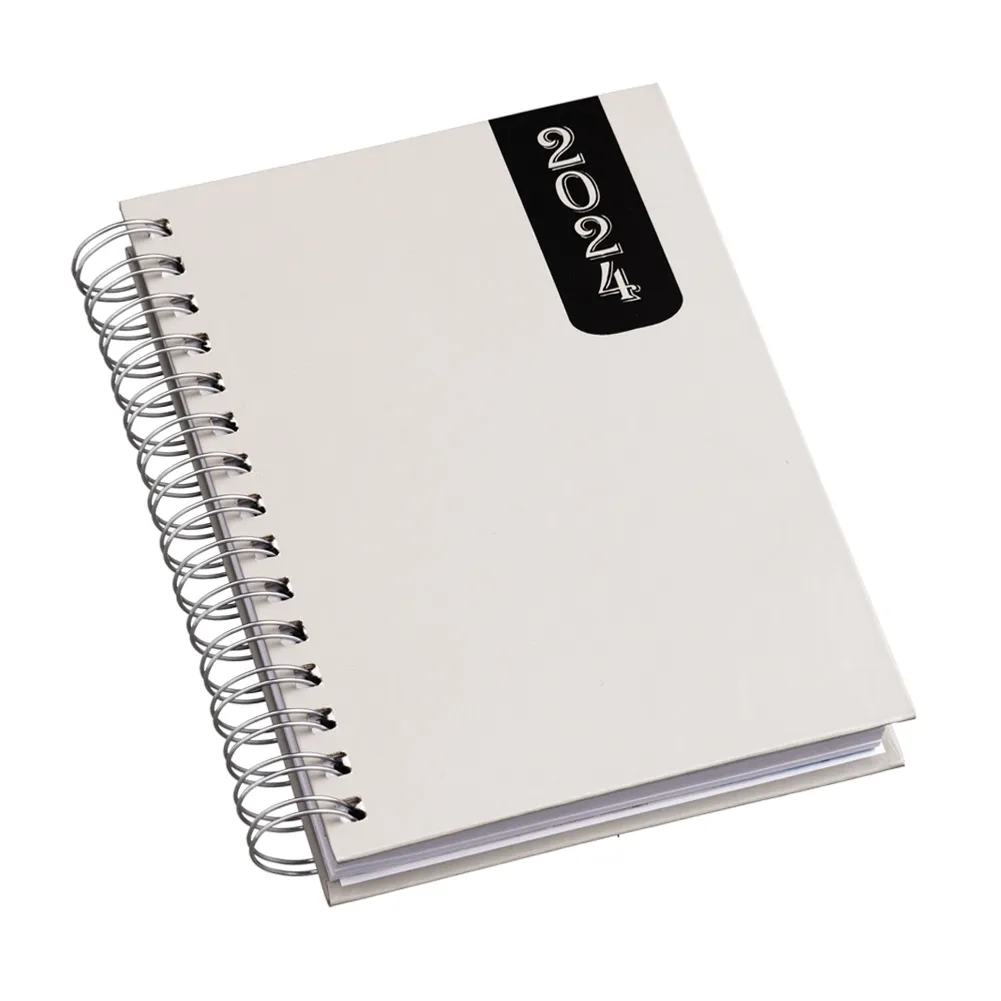 Agenda diária wire-o com capa produzida em prime, frente e verso liso, apenas com detalhe do ano ‘2024’ na parte superior direita. Contém “bolso” plástico atrás da capa, dados pessoais, calendário de 2023 à 2025, mapa do Brasil, mapa global, índice telefônico e planejamento. OBS.: PEDIDOS APENAS MÚLTIPLOS DE 10 PEÇAS!