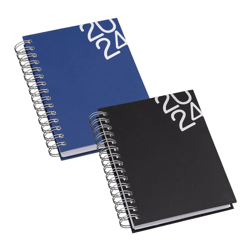 Agenda Wire-o produzida em material sintético, frente e verso liso, apenas com detalhe do ano ‘2024’ na parte superior direita. Contém “bolso” plástico atrás da capa, dados pessoais, calendário de 2023 à 2025, mapa do Brasil, mapa global, índice telefônico e planejamento.