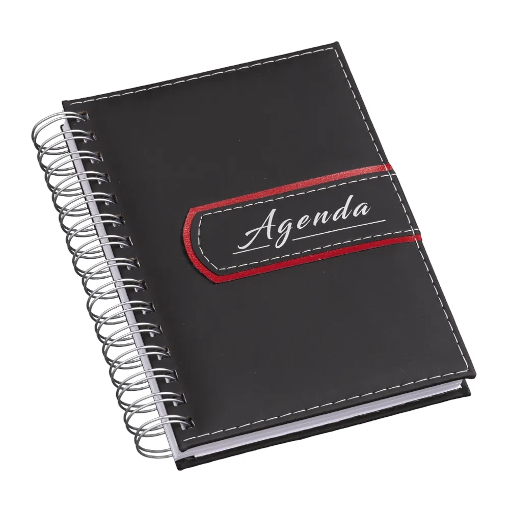 Agenda diária 2024 em couro sintético com wire-o. Possui "bolso" plástico, página para dados pessoais, calendário 2023 á 2025, mapa do Brasil, mapa global, índice telefônico e planejamento.