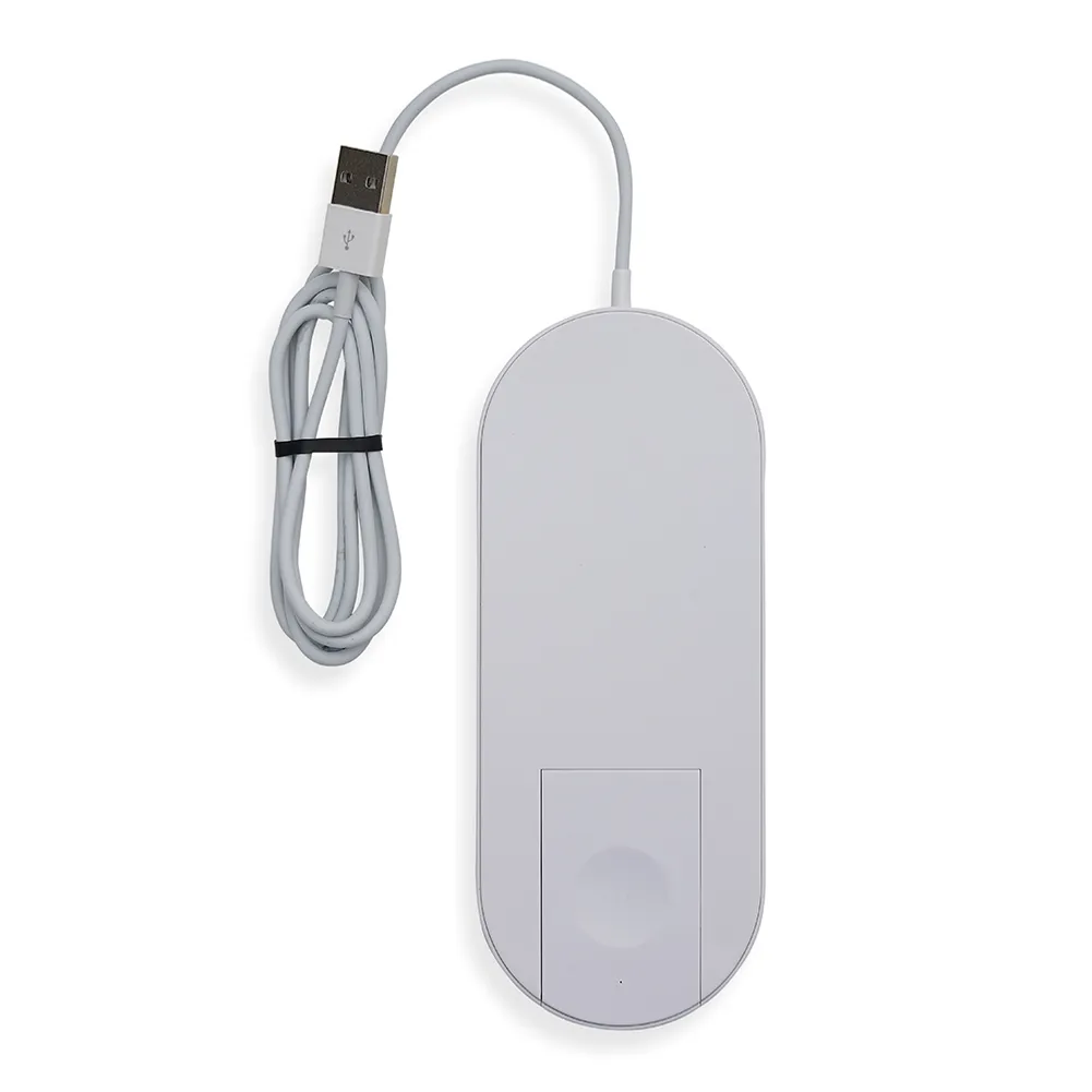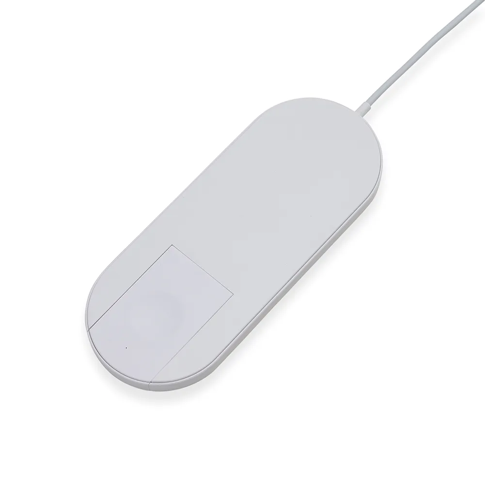Base de carregamento por indução para celular e Iwatch. Com área de indução inclinável para o Iwatch, a base contém borrachas antideslizantes e cabo USB acoplado.