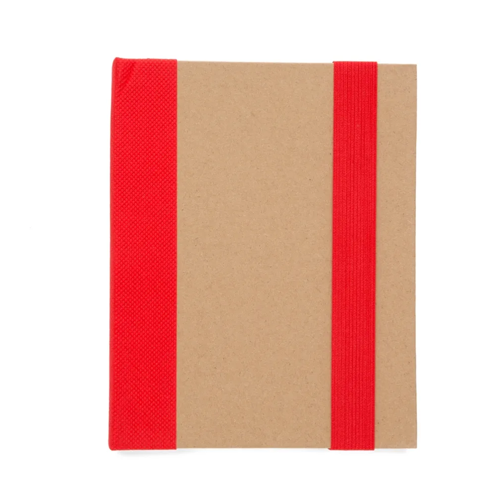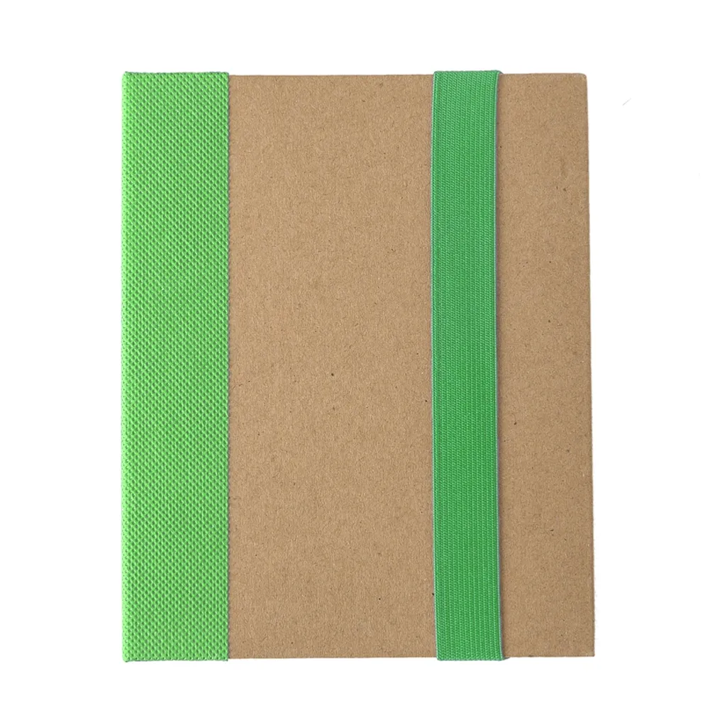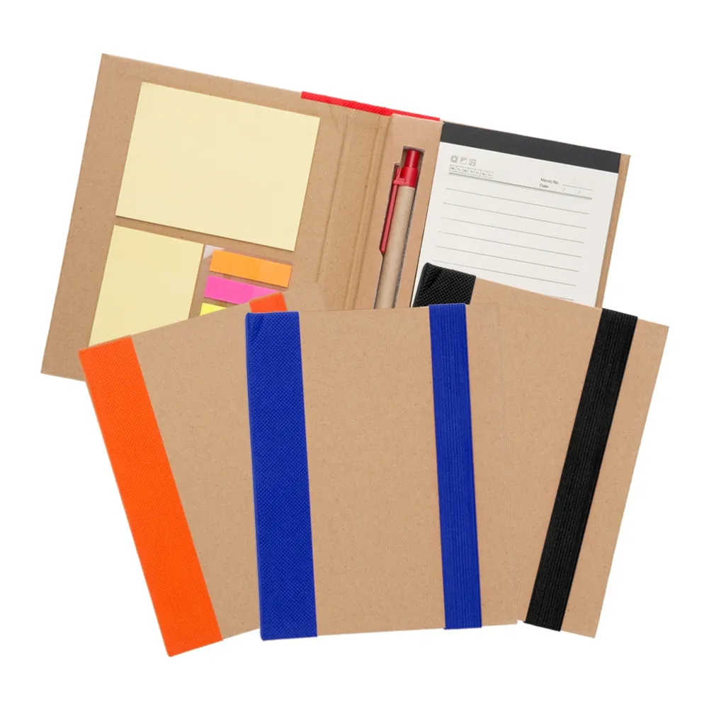 Bloco de anotações ecológico com caneta e autoadesivos, material kraft. Possui uma faixa colorida em tnt e fita elástica, parte interna com suporte para caneta de papelão com clip plástico; bloco amarelo médio com aproximadamente 20 folhas; bloco amarelo pequeno com aproximadamente 20 folhas; cinco blocos autoadesivos coloridos com aproximadamente 20 folhas cada e bloco de folhas pardas com aproximadamente 70 folhas.