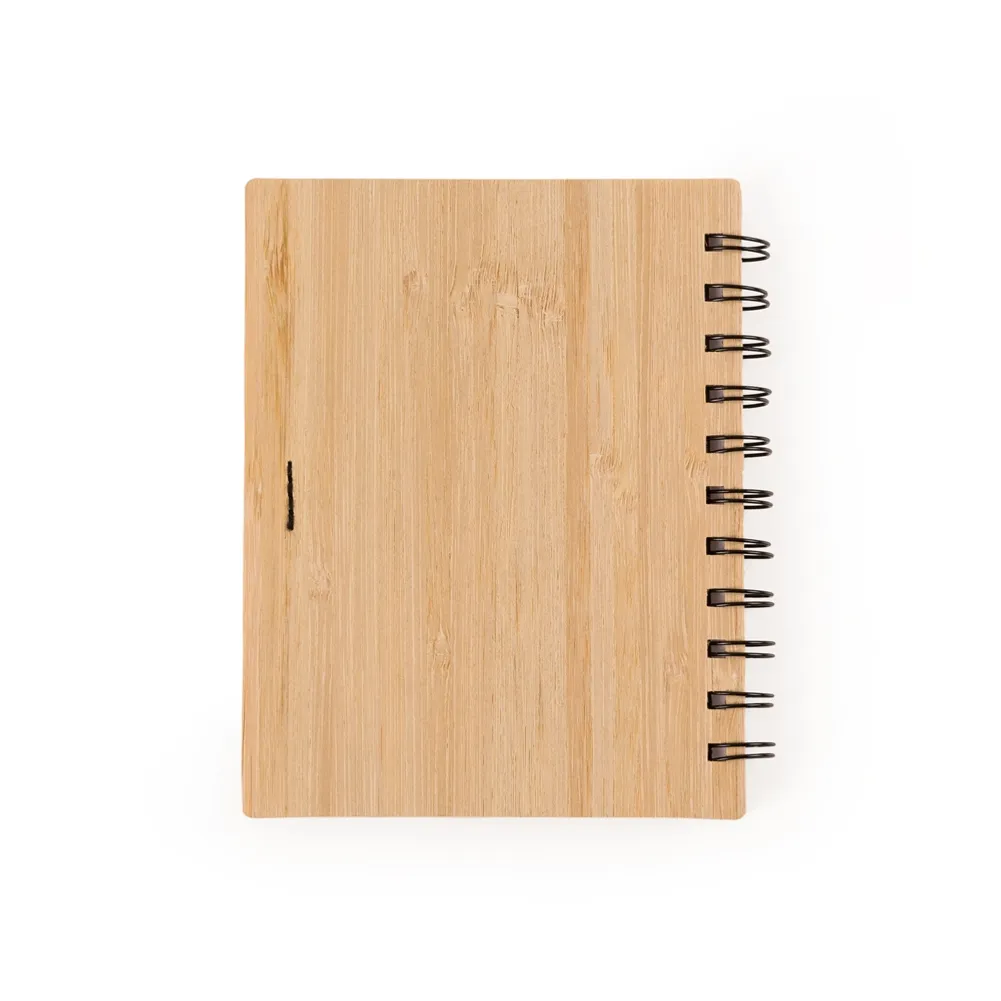 Bloco de anotações ecológico com caneta e autoadesivos. Capa de bambu com uma faixa preta no lado esquerdo e verso liso. Possui cinco blocos autoadesivos coloridos com aproximadamente 20 folhas cada, 70 folhas aproximadamente brancas pautadas com logo reciclado na lateral inferior. Acompanha suporte elástico de nylon com uma caneta de papelão com acessórios plásticos.