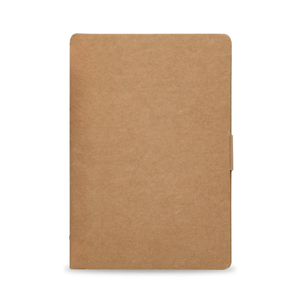 Bloco de anotações ecológico, material em kraft. Possui uma trava na própria capa, cinco blocos autoadesivos coloridos com aproximadamente 25 folhinhas , bloco autoadesivo amarelo com aproximadamente 25 folhas e bloco grande com aproximadamente 70 folhas.