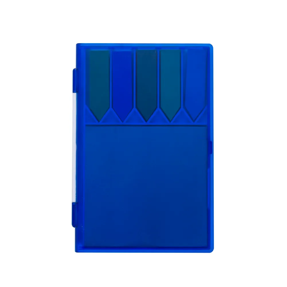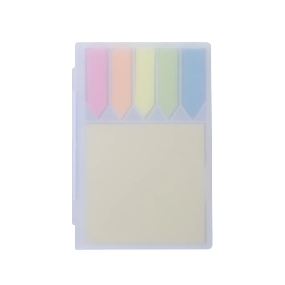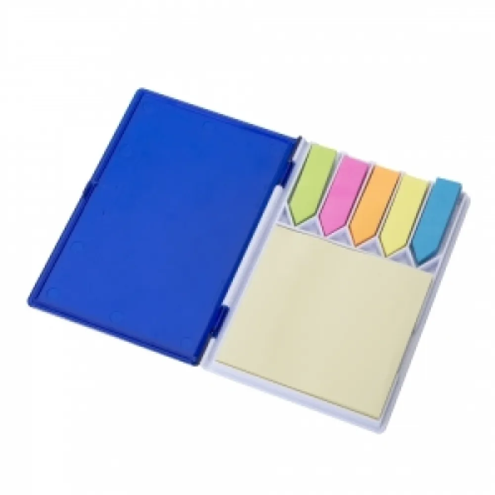 Bloco de anotações plástico com autoadesivos, capa colorida e base branca. Possui cinco bloquinhos autoadesivos com aproximadamente 50 folhas cada e um bloco maior com folhas amarelas sem pauta, aproximadamente 50 folhas.