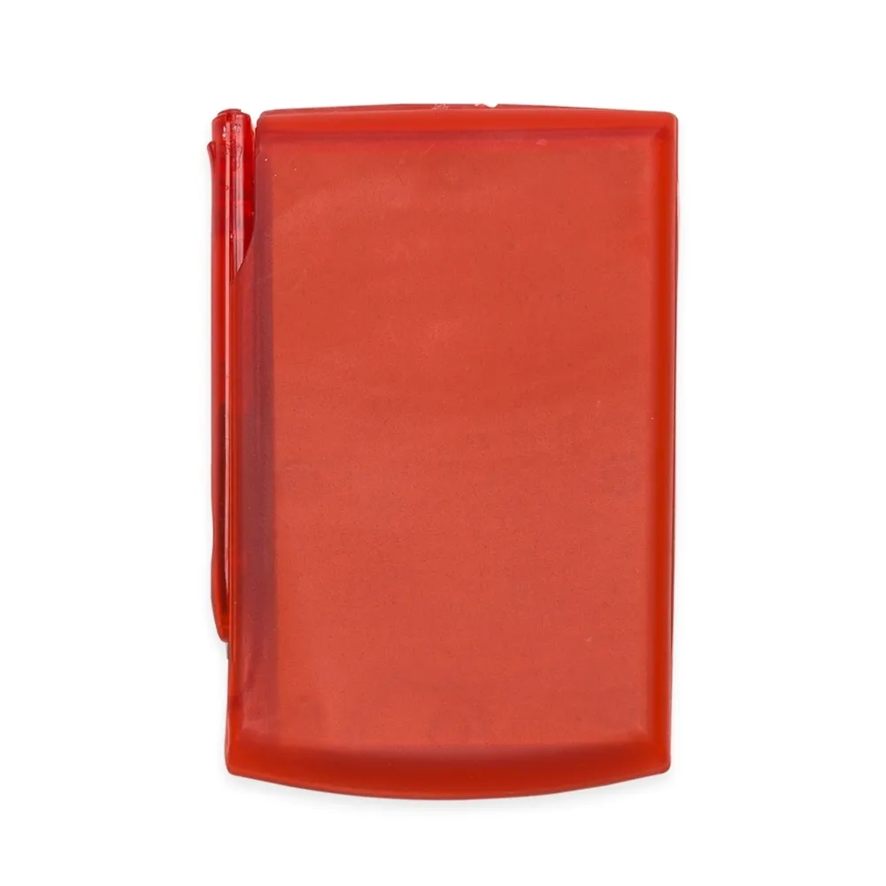 Bloco de anotações plástico com autoadesivos e caneta. A caneta fica localizada na lateral frontal, possui um encaixe no versa dela que também serve para fechar o bloco. Capa com detalhes e verso liso, parte interna com cinco blocos autoadesivos com aproximadamente 20 folhas cada e bloco de rascunho branco com aproximadamente 50 folhas.