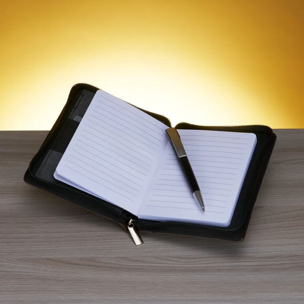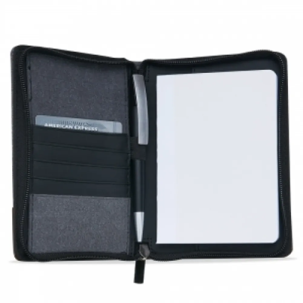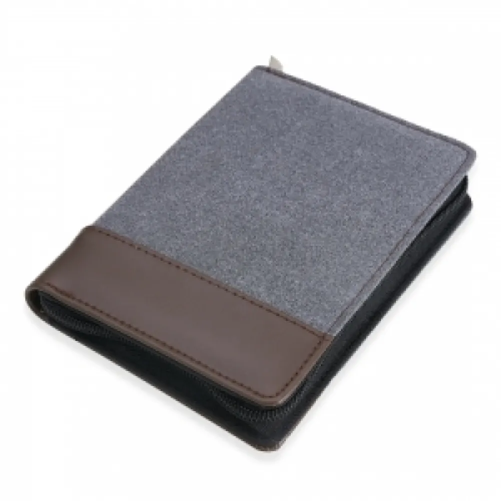 Bloco de anotações executivo com zíper. Capa de feltro com detalhe inferior em couro sintético, parte interna possui 5 divisões para cartões, aproximadamente 80 folhas amarelas pautadas e contra capa com suporte em feltro para caneta(não acompanha).