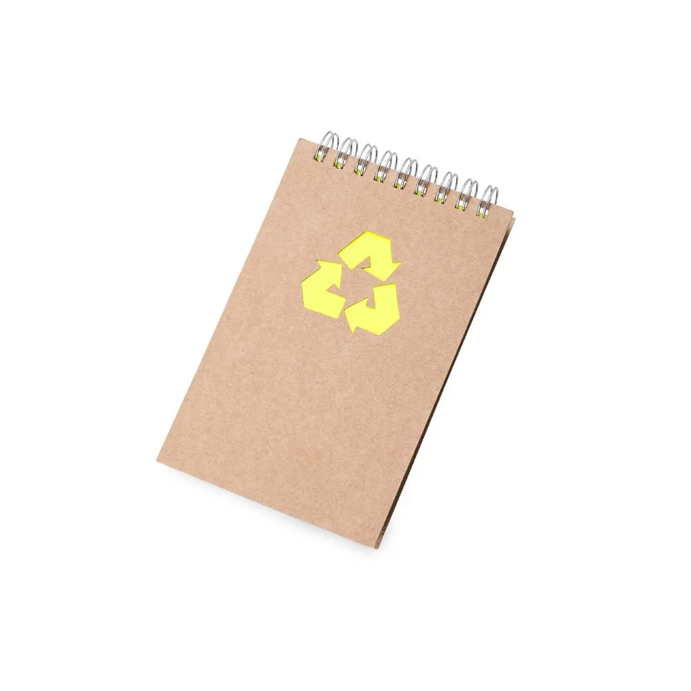Bloco de anotações ecológico com wire-o. Contém aproximadamente 80 páginas pautadas na cor branca.