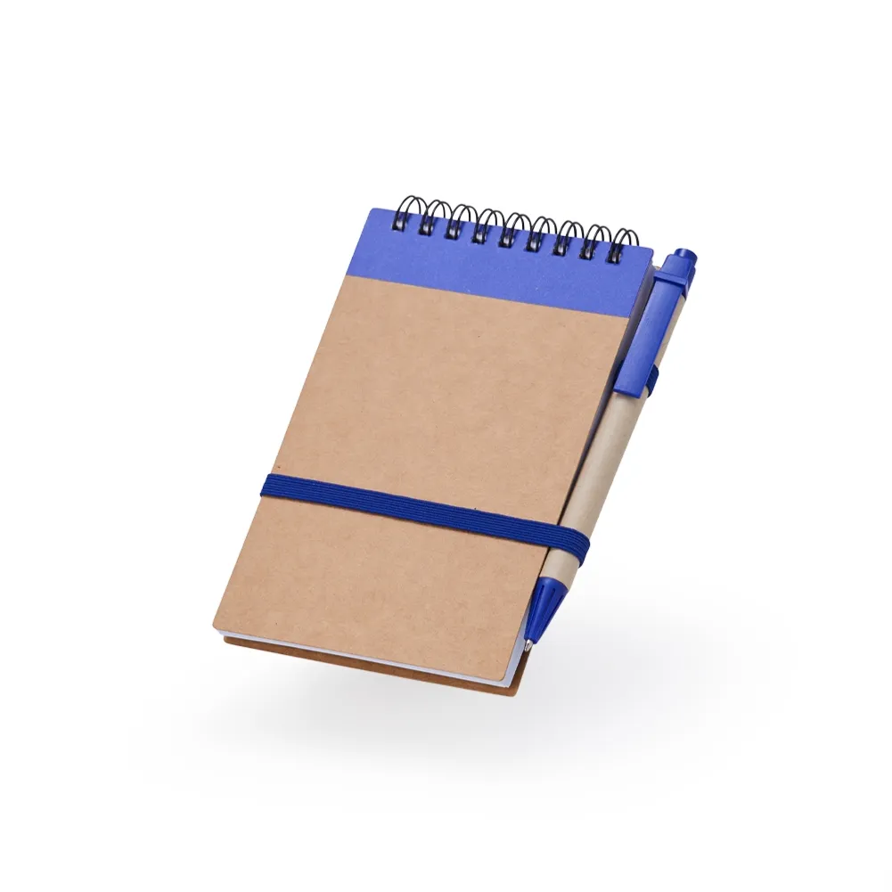 Bloco de anotações ecológico com caneta, feito em kraft com detalhe plástico. Contém aproximadamente 70 folhas brancas com pauta, porta caneta elástico, elástico para lacre e acompanha caneta de papelão com detalhes plásticos, carga esferográfica azul 1.0mm e acionamento por clique.