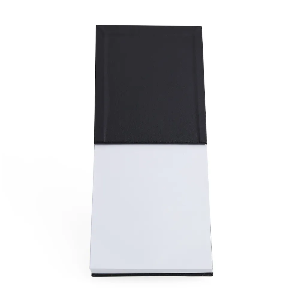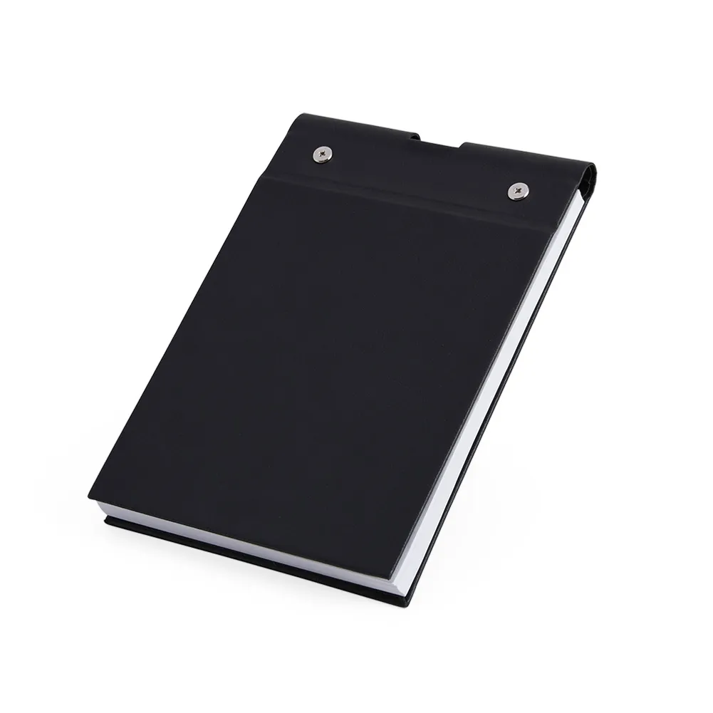 Bloco de anotações em couro sintético com porta caneta. Possui aproximadamente 100 folha brancas sem pauta.