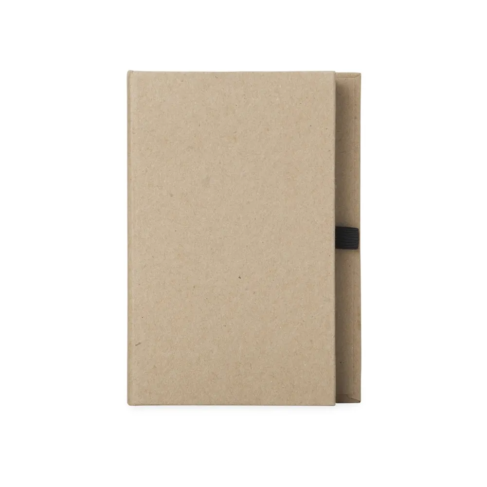 Bloco de anotações capa dura em kraft com porta caneta e wire-o. Contém aproximadamente 100 páginas não pautadas na cor branca.