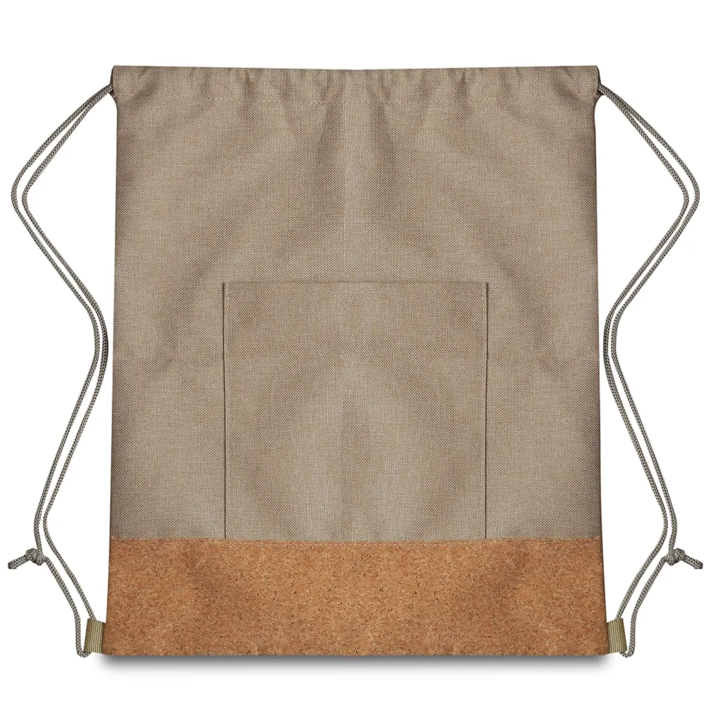 Bolsa em poliéster 600D com detalhe em cortiça, alça dupla para colocar nas costas e bolso frontal.  Dimensão Produto: 34cm x 38,5cm Peso do Produto: 0,086kg Capacidade: 1,3L Quant. por Caixa: 100pçs Dimensão Caixa: 45x35x25cm Peso da Caixa: 13 kg
