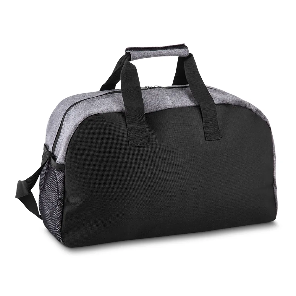 Bolsa esportiva de poliéster. Possui bolso frontal, bolso lateral de malha e bolso grande superior. Alça de mão com pegador cinza de velcro e alça transversal ajustável.
