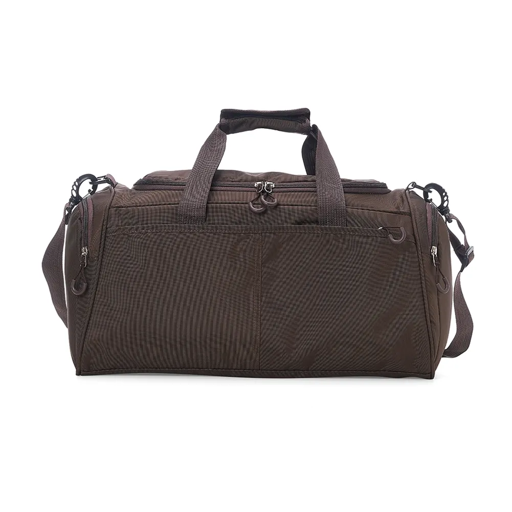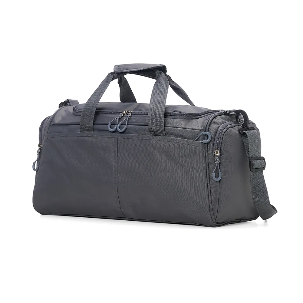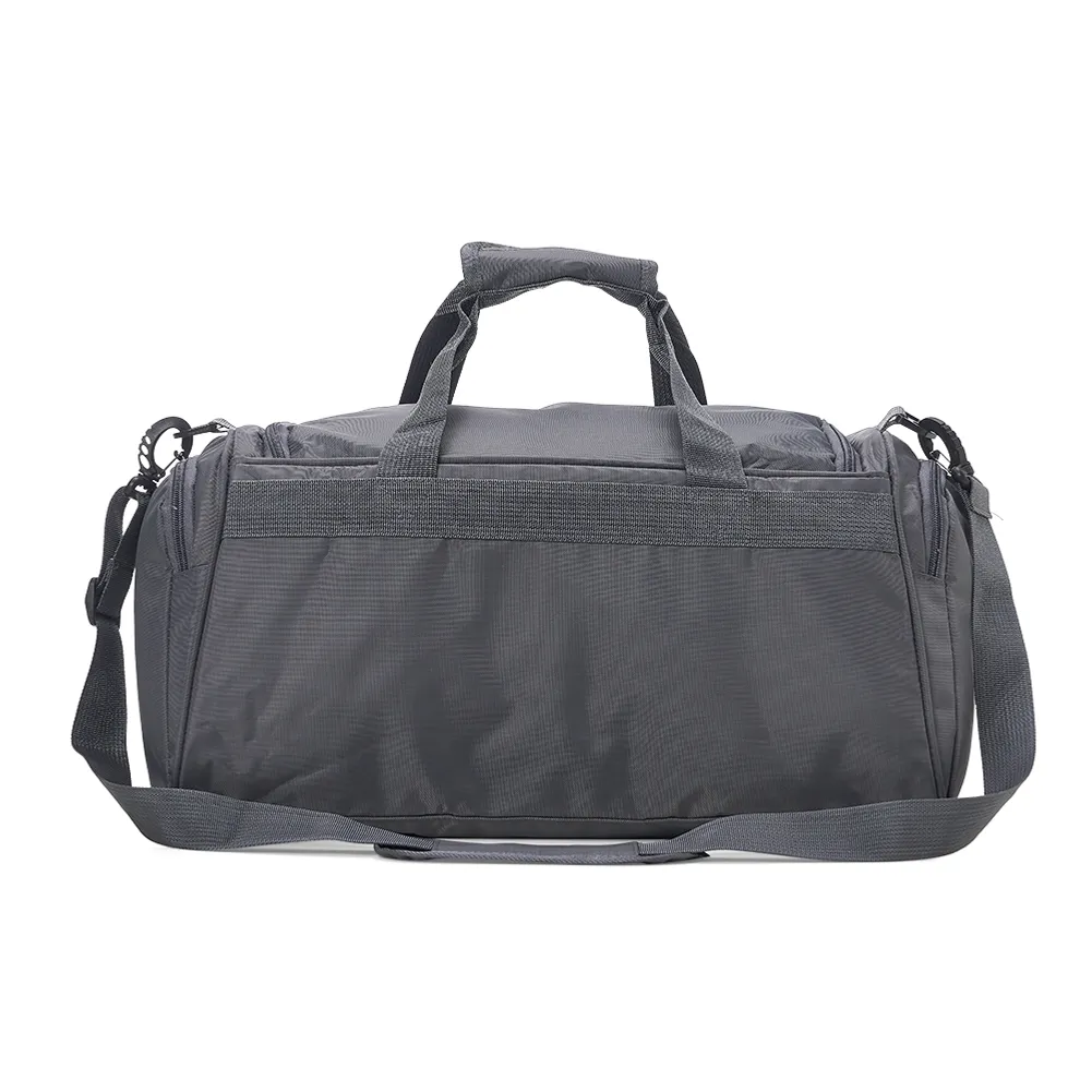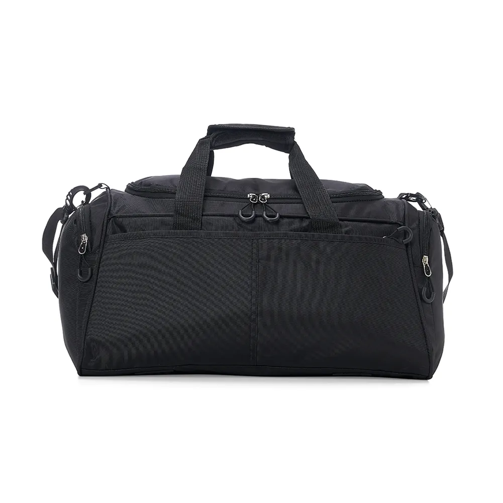 Bolsa de viagem de 28 litros em poliéster oxford resistente à água com quatro compartimentos. Contém alça de mãos com suporte de juntura, bases antiderrapantes e acompanha alça transversal com suporte de apoio para ombro.