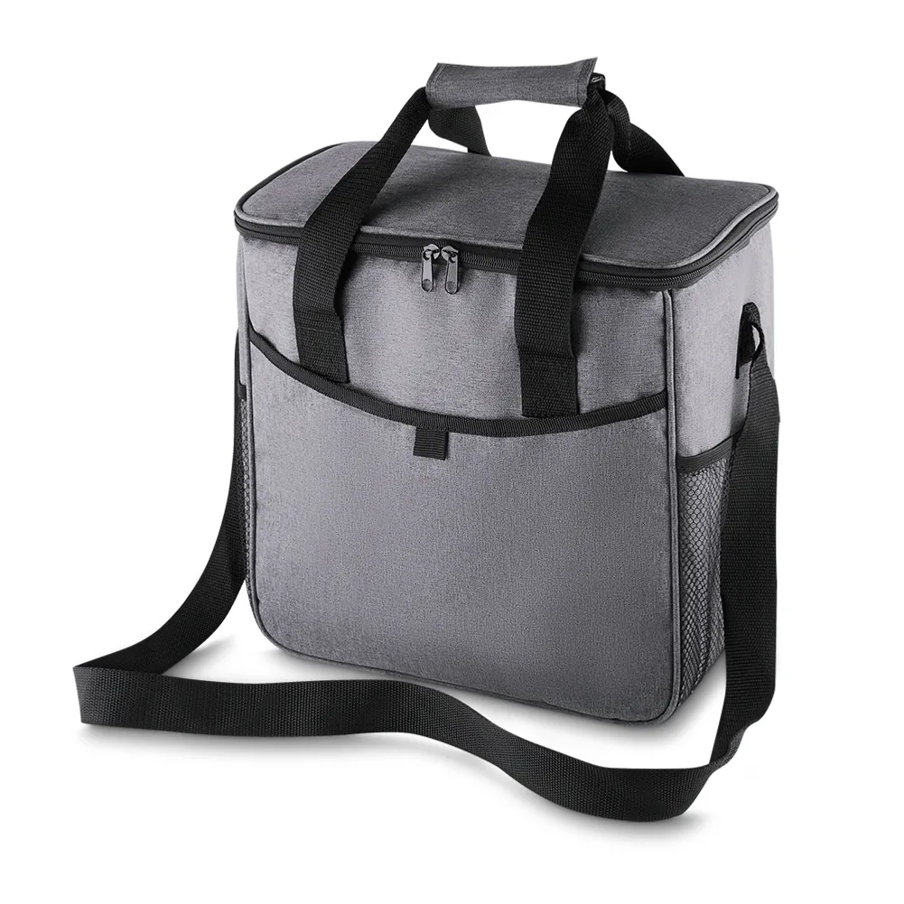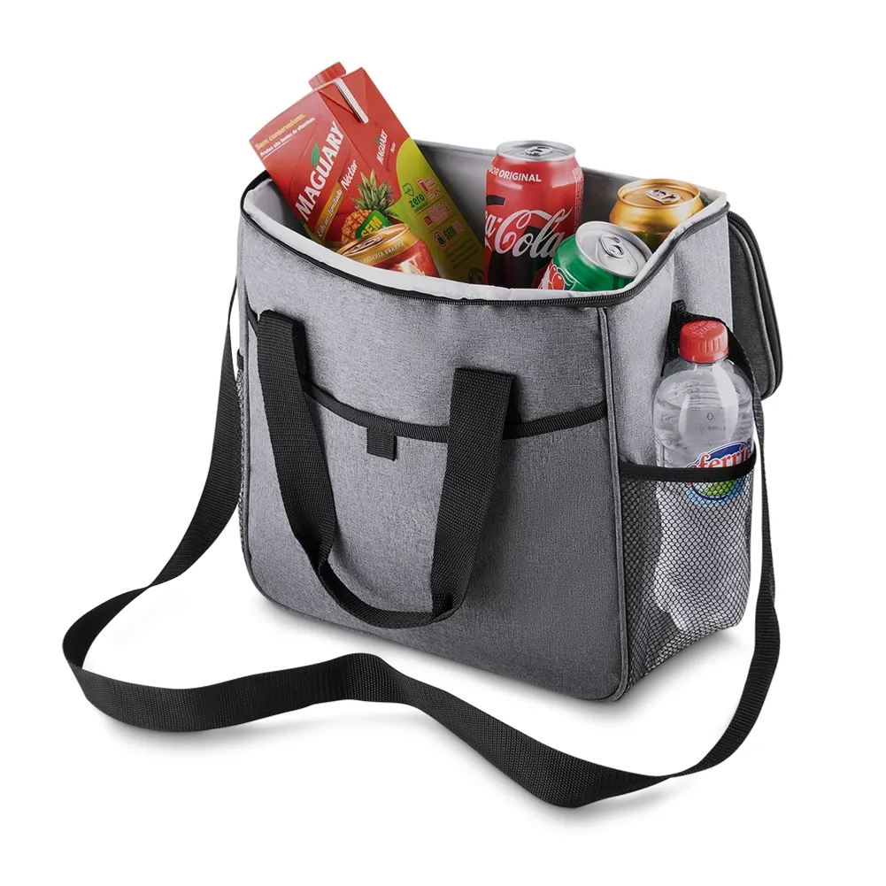 Bolsa térmica 16 litros confeccionada em nylon e poliéster. Possui bolso frontal, bolsos laterais de malha, alça de mão com pegador cinza de velcro e alça ajustável para as costas.