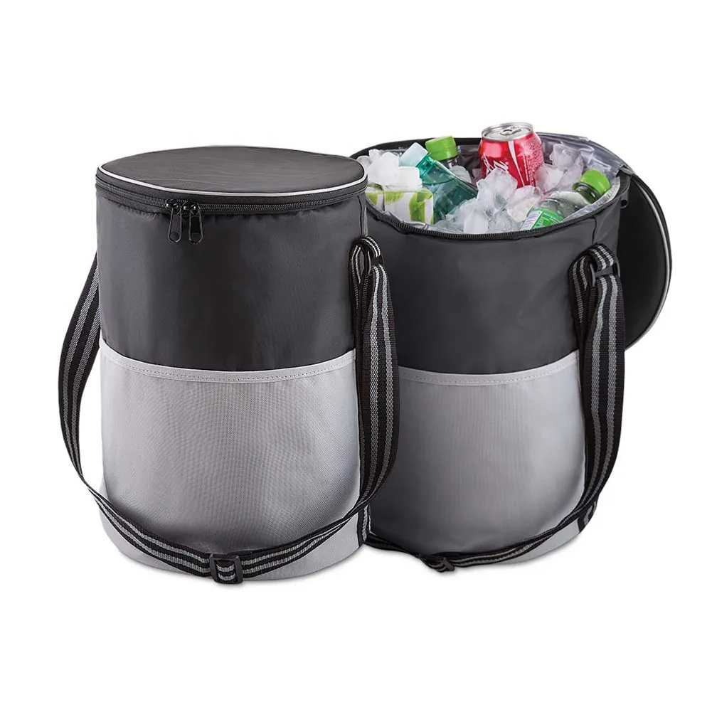 Bolsa térmica, capacidade 25 litros, tecido nylon e polyester na cor preta e cinza, bolso frontal, alça de ombro regulável, parte interna soldada = retém liquido, gravação bolso frontal ou tampa.