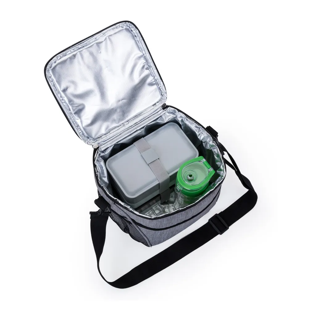 Bolsa térmica, capacidade 12 litros, tecido nylon poliéster (cinza), bolso frontal, dois bolsos laterais, alça de ombro ajustável, alça de mão, parte interna soldada / retém liquido, cor cinza, gravação bolso frontal.