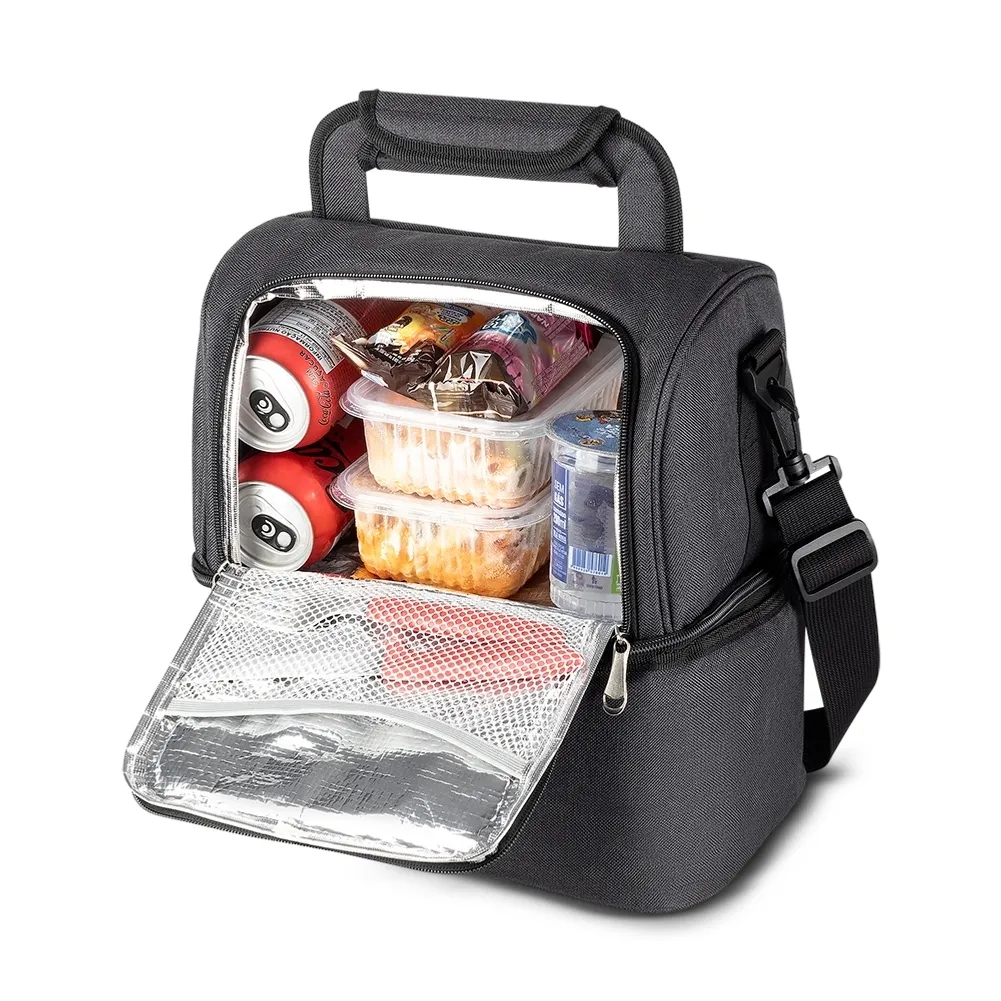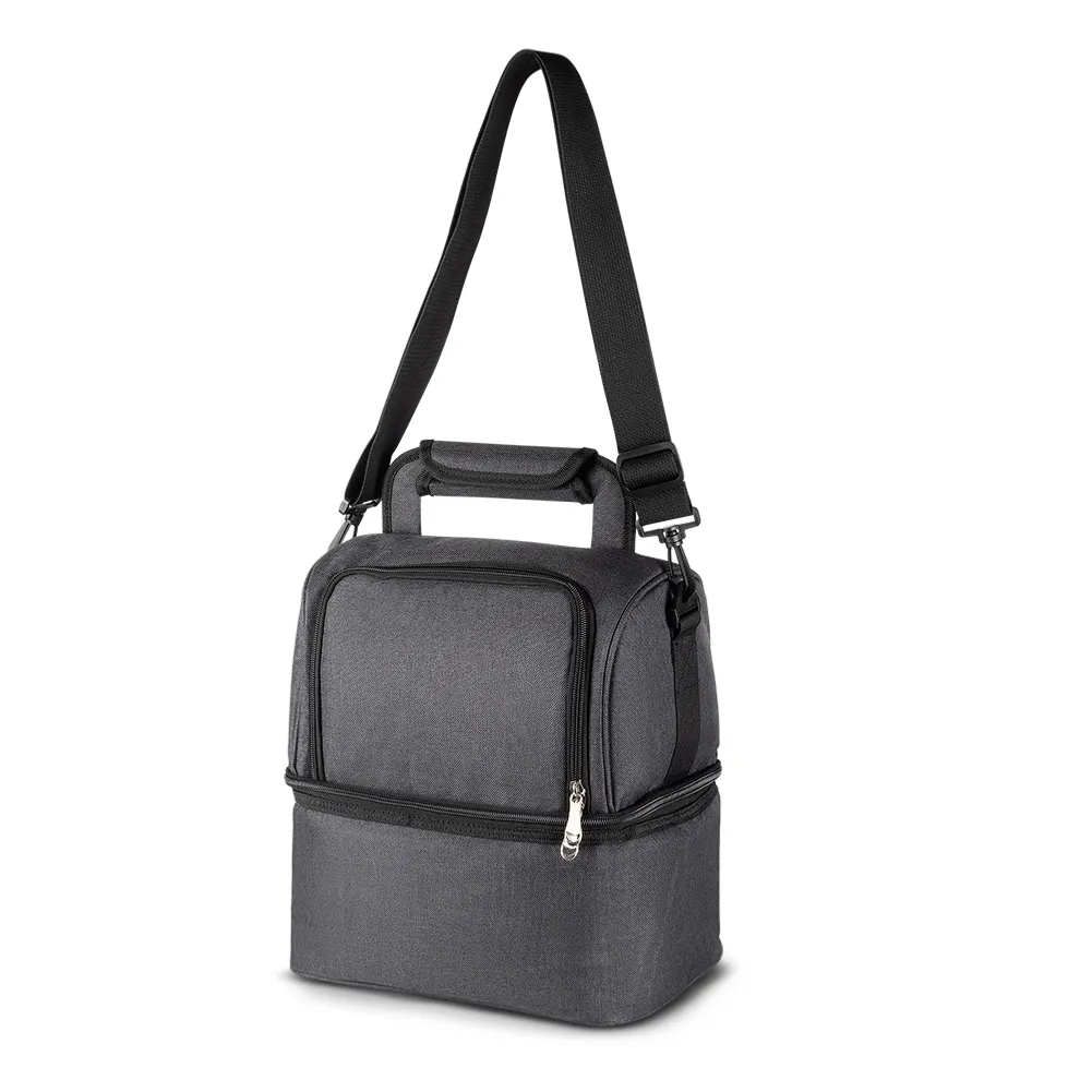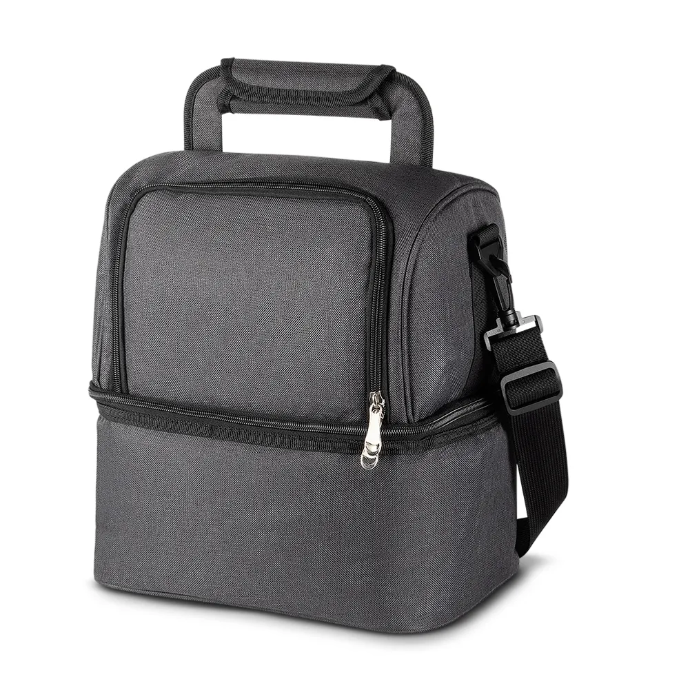 Bolsa térmica em tecido poliéster, bolso frontal, alça de mão, alça de ombro regulável com 2 compartimentos térmicos.