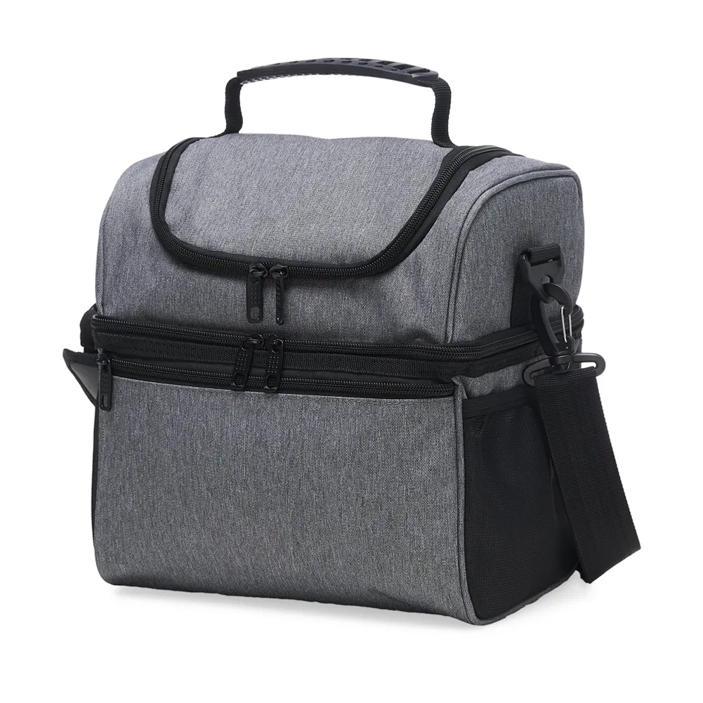 Bolsa térmica dupla de nylon com três compartimentos, capacidade de 16 litros. Contém dois compartimentos térmicos isolados, sendo o principal com costura soldada (não vaza). A bolsa possui alça de mão com pegador plástico, bolsos laterais em malha e acompanha alça transversal.