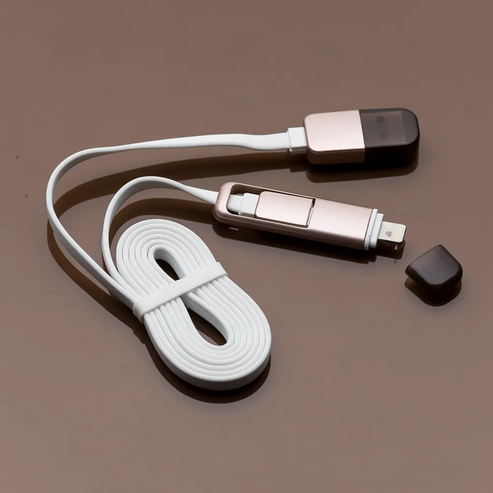 Cabo de dados USB com entradas V8/Android e Lightning/iPhone. Acompanha tampas de proteção.