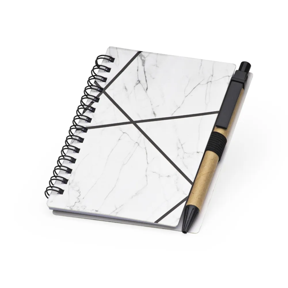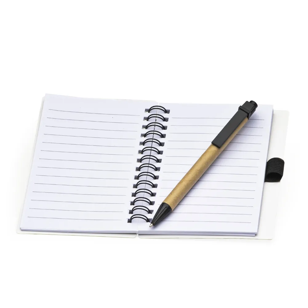 Caderneta com capa em papel com acabamento brilhoso e porta caneta, possui aproximadamente 70 folhas brancas pautadas. Acompanha caneta de papelão com detalhes plásticos, carga esferográfica azul e acionamento por clique.