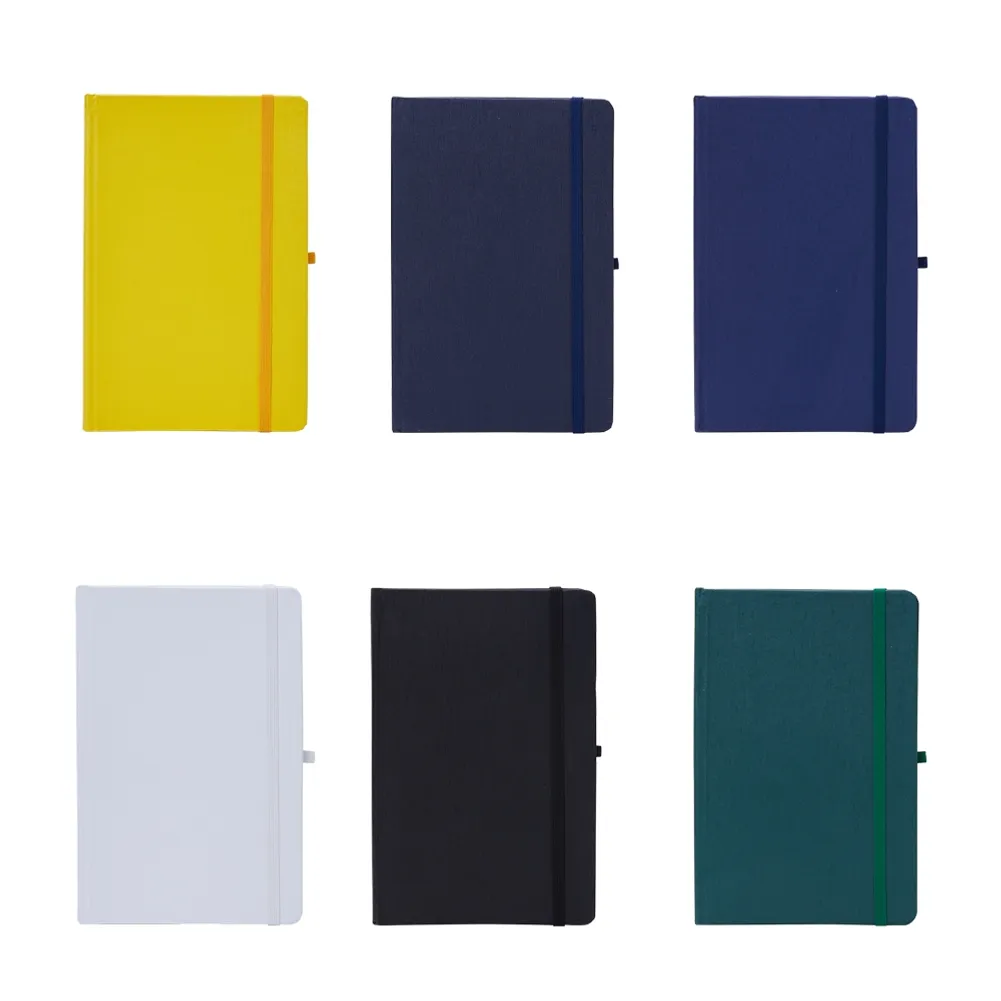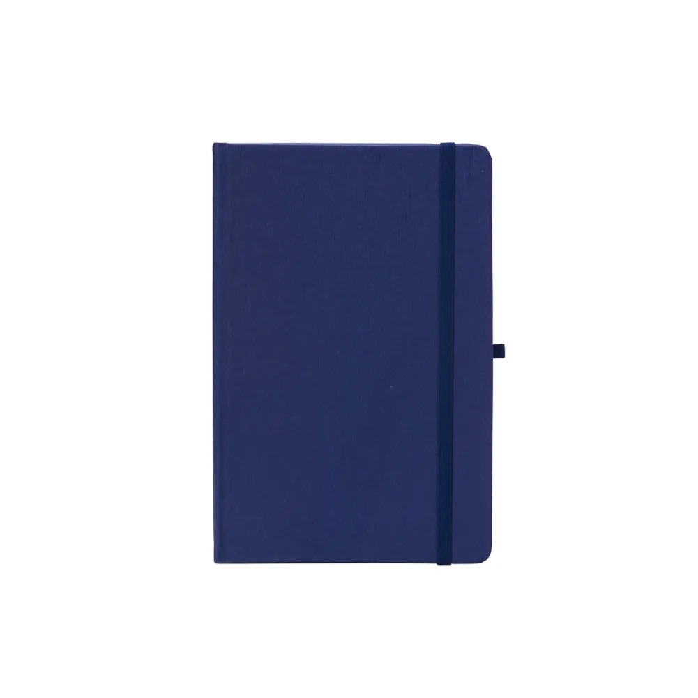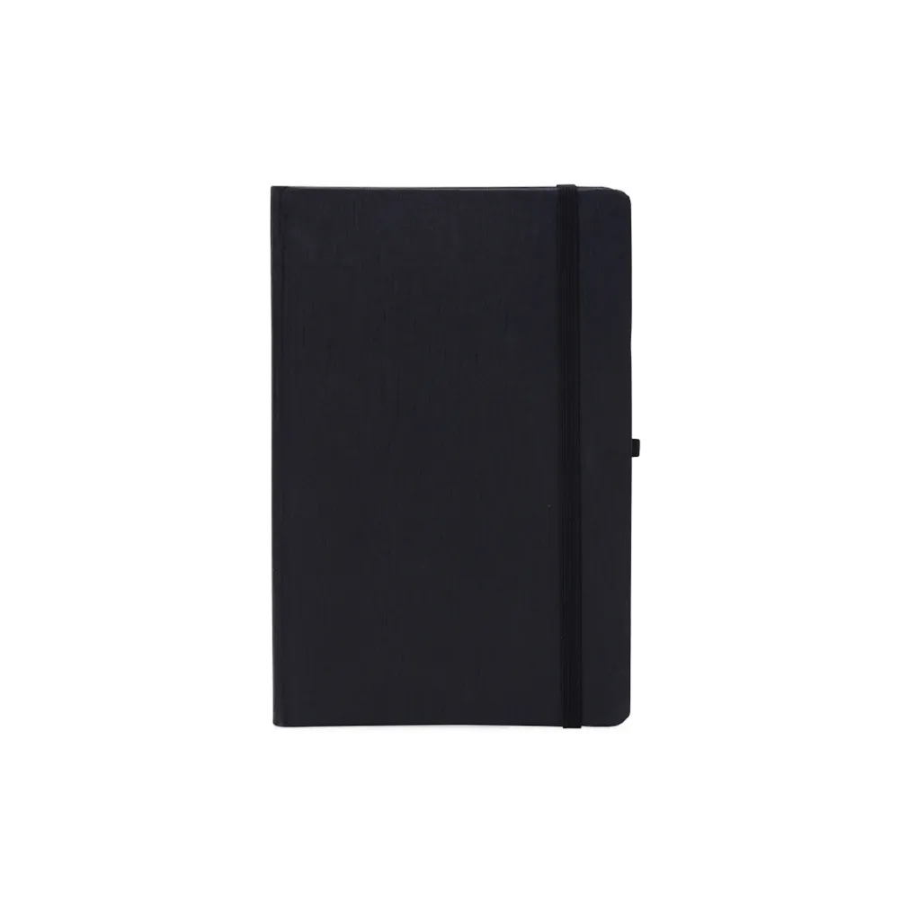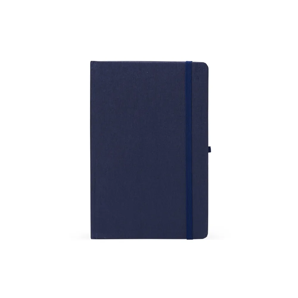 Caderneta em percalux escovado com suporte para caneta, elástico para lacre e marcador de página em cetim, contém aproximadamente 80 folhas com pauta na cor branca.