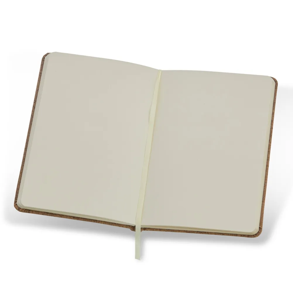 Caderneta em cortiça, possui marca página em cetim e elástico para lacre. Contém aproximadamente 80 folhas marfim sem pauta.