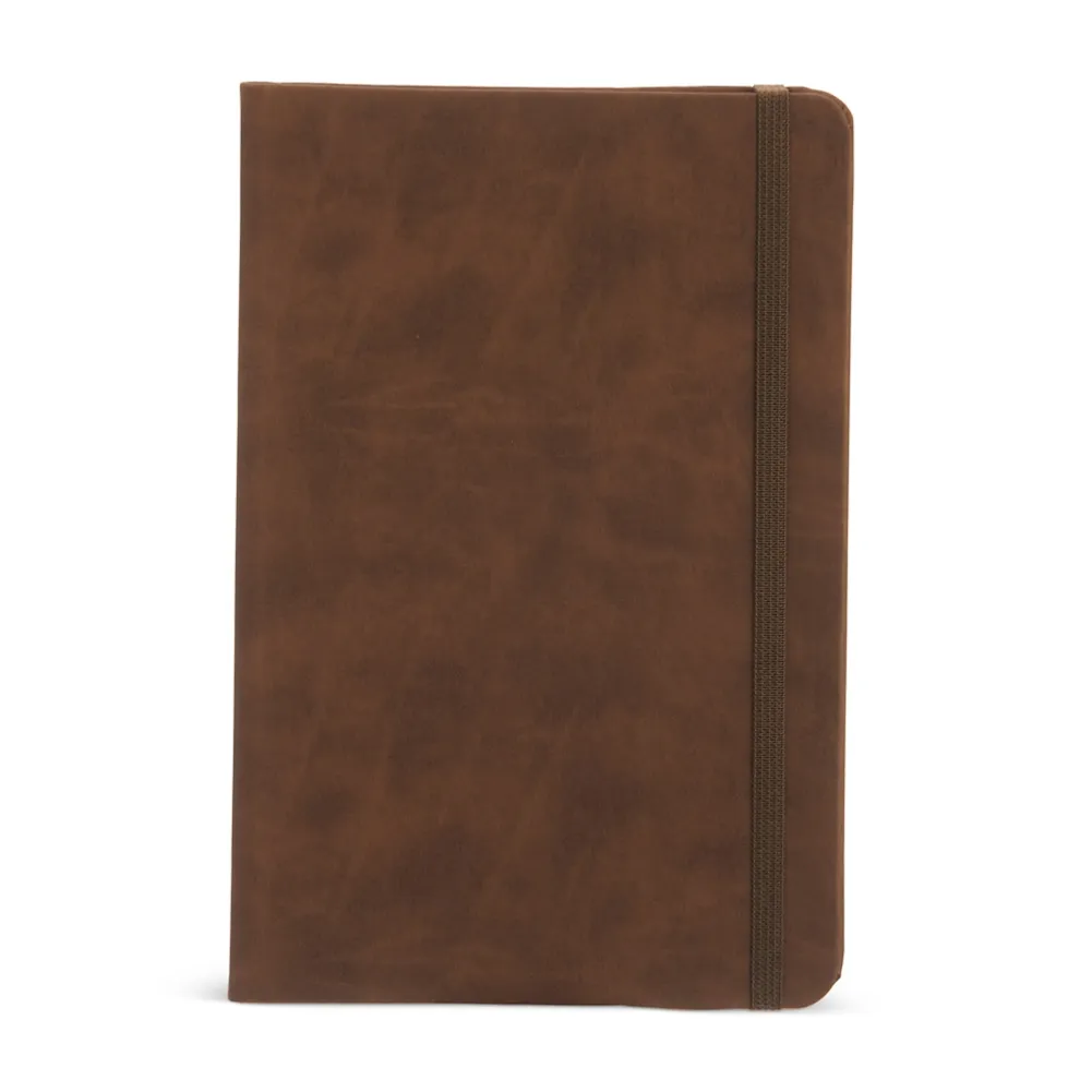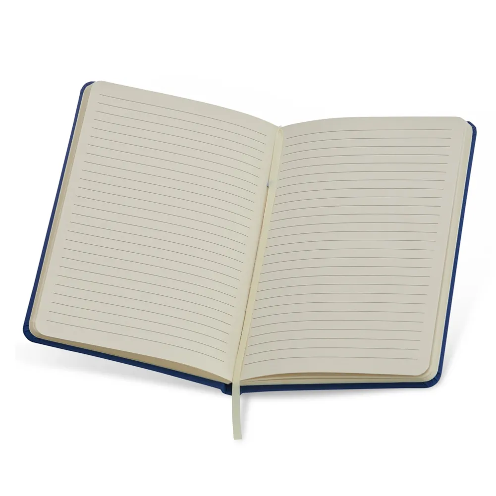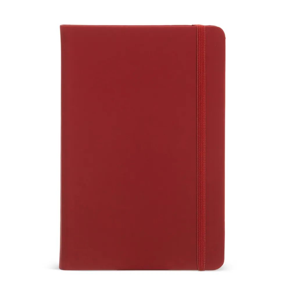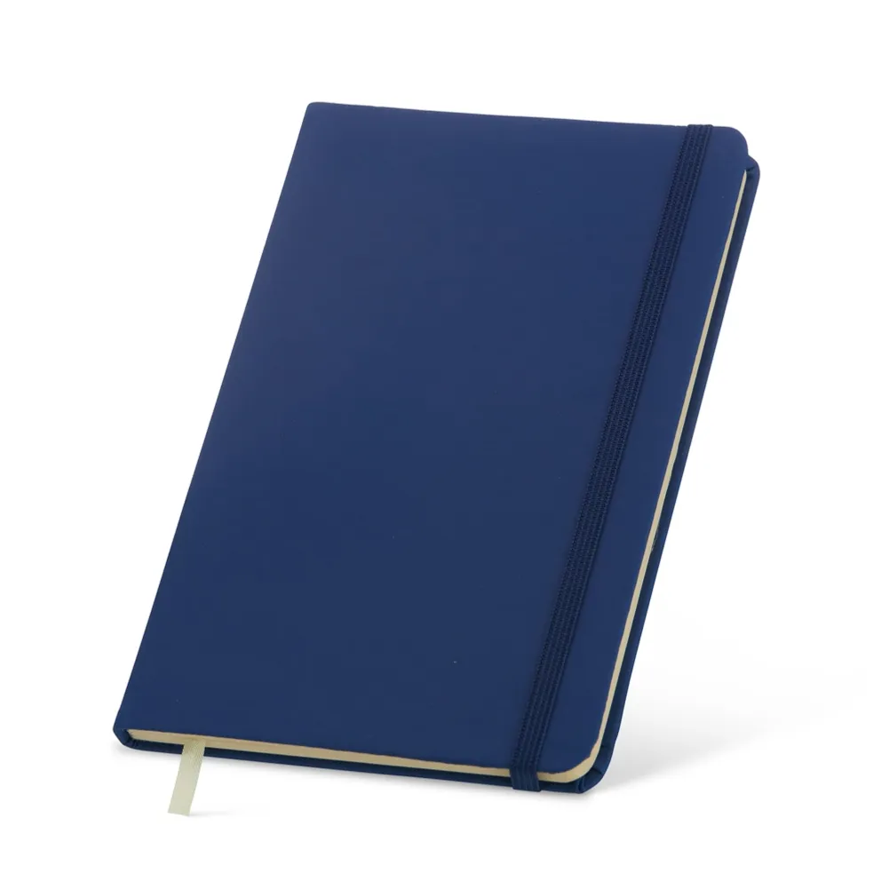 Caderneta em couro sintético emborrachado, possui marca página em cetim e elástico para lacre. Contém aproximadamente 80 folhas marfim pautadas.