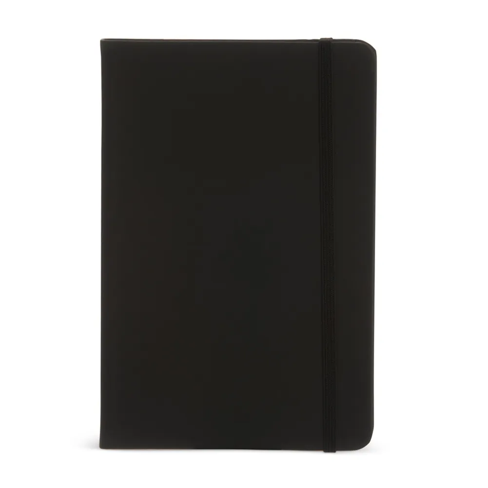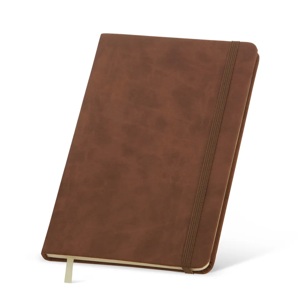 Caderneta em couro sintético emborrachado, possui marca página em cetim e elástico para lacre. Contém aproximadamente 80 folhas marfim sem pauta.
