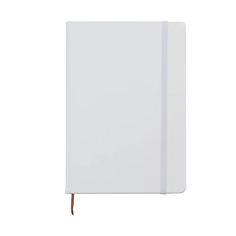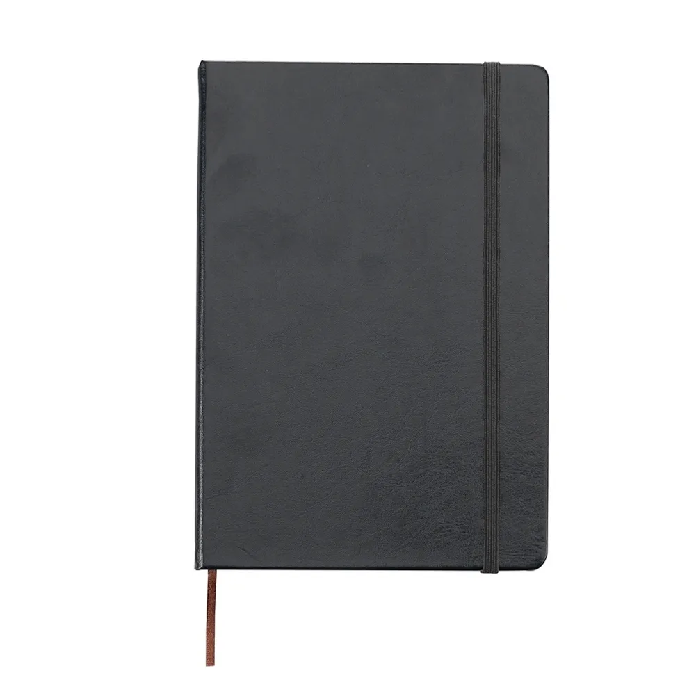 Caderneta de couro sintético, marcador de página em cetim e fita elástica para fechar. Contém aproximadamente 78 folhas amareladas sem pauta.